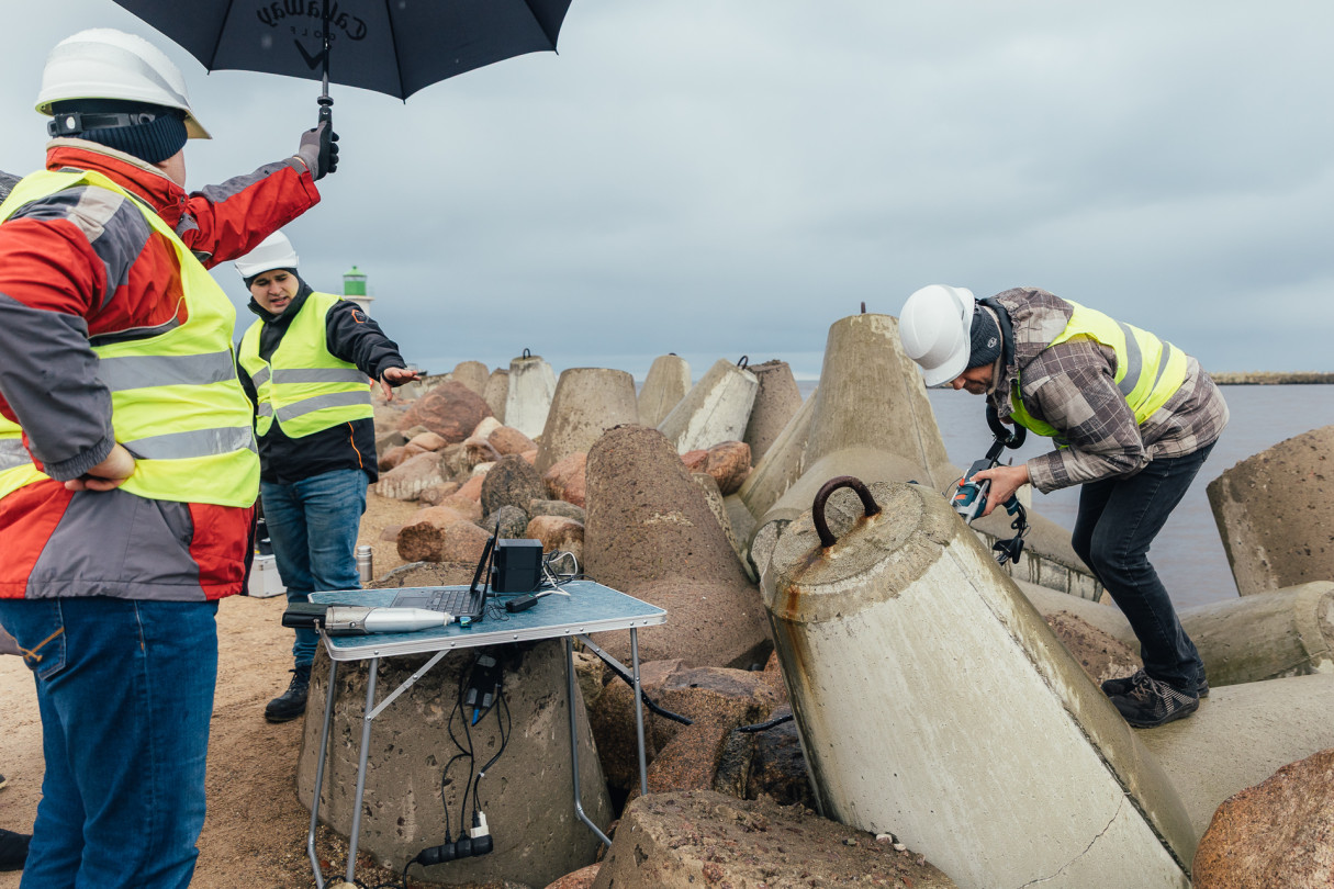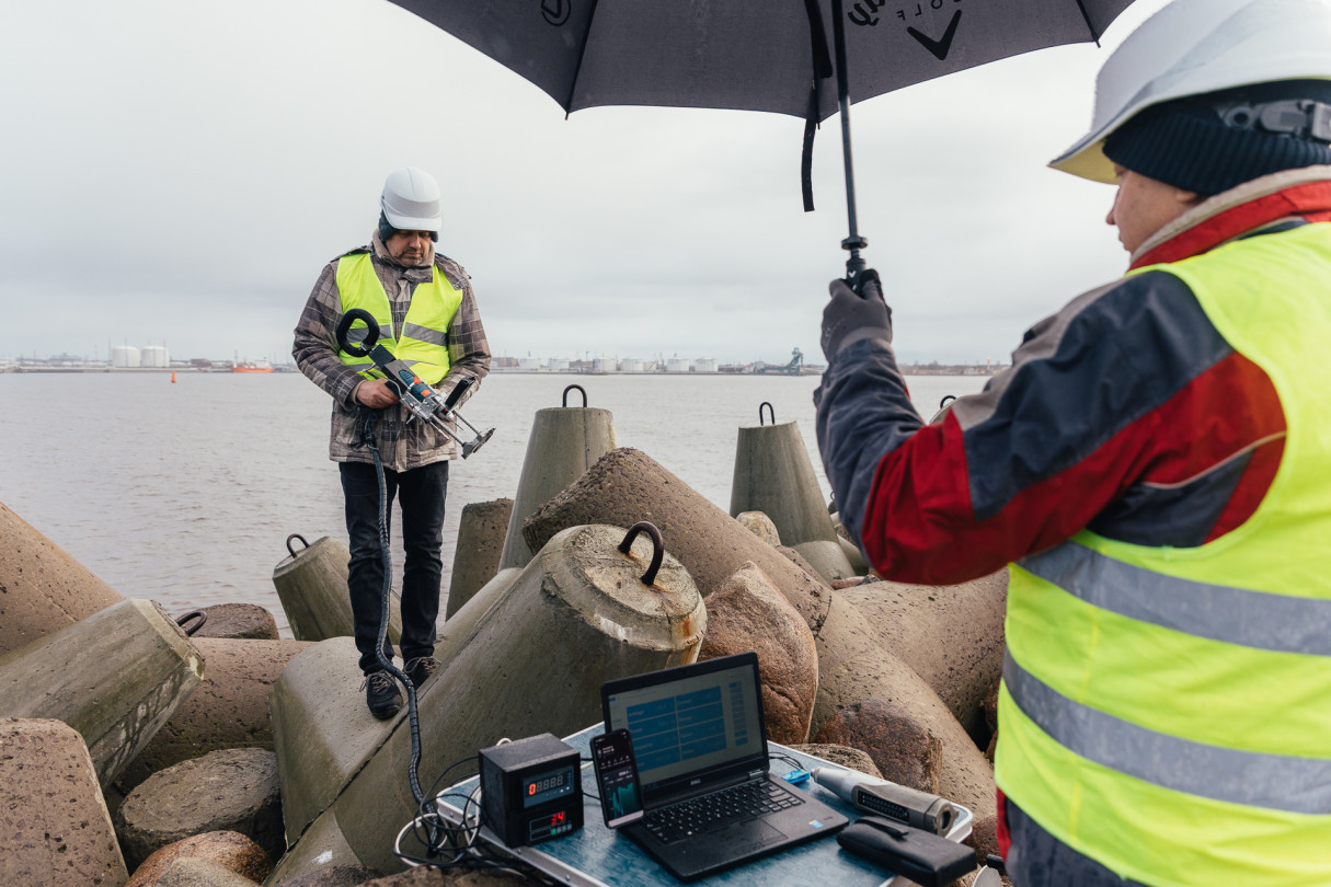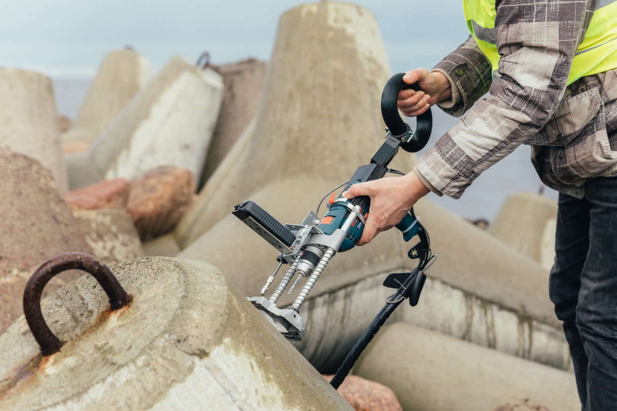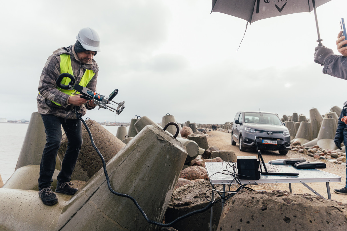 RTU pētnieki veic betona testēšanu dienvidu mola tetrapodiem