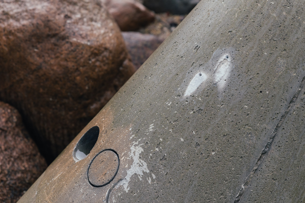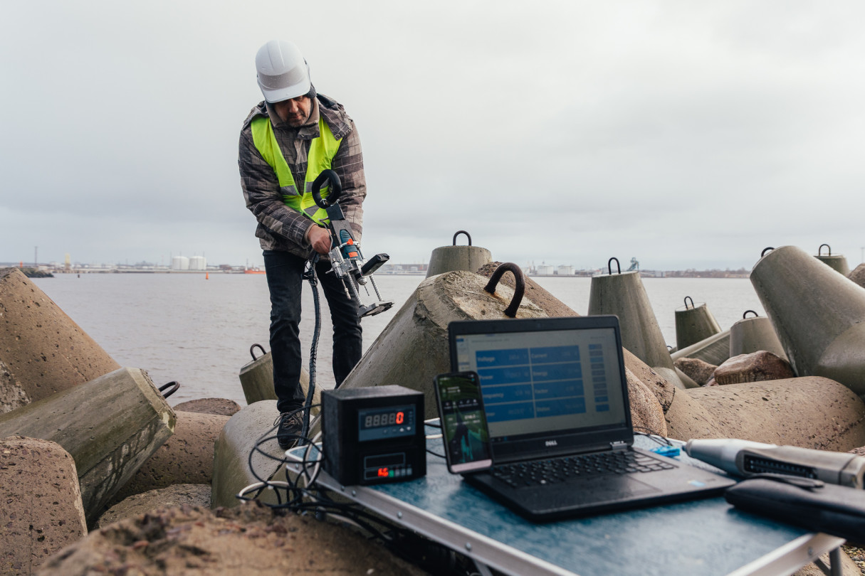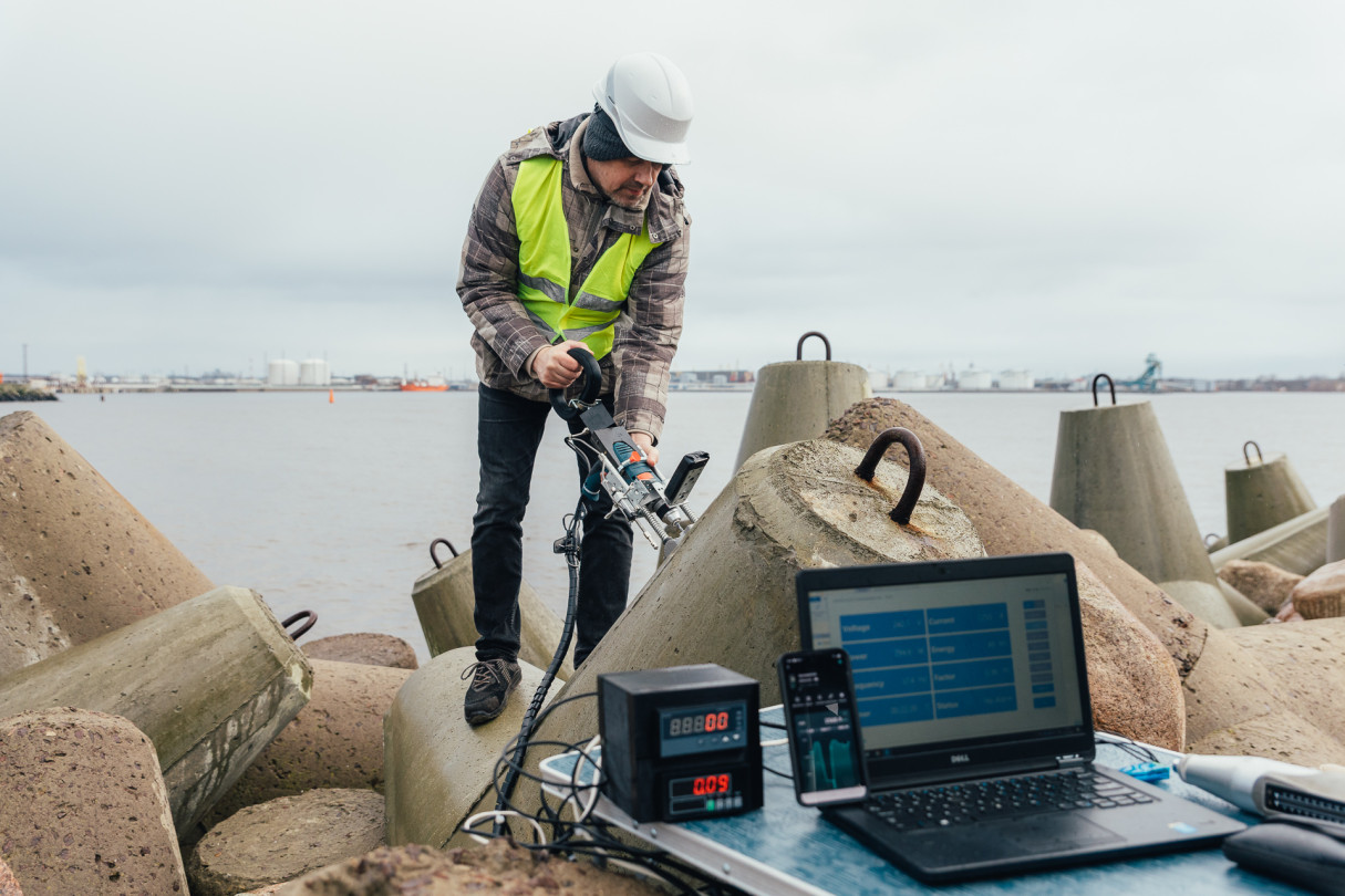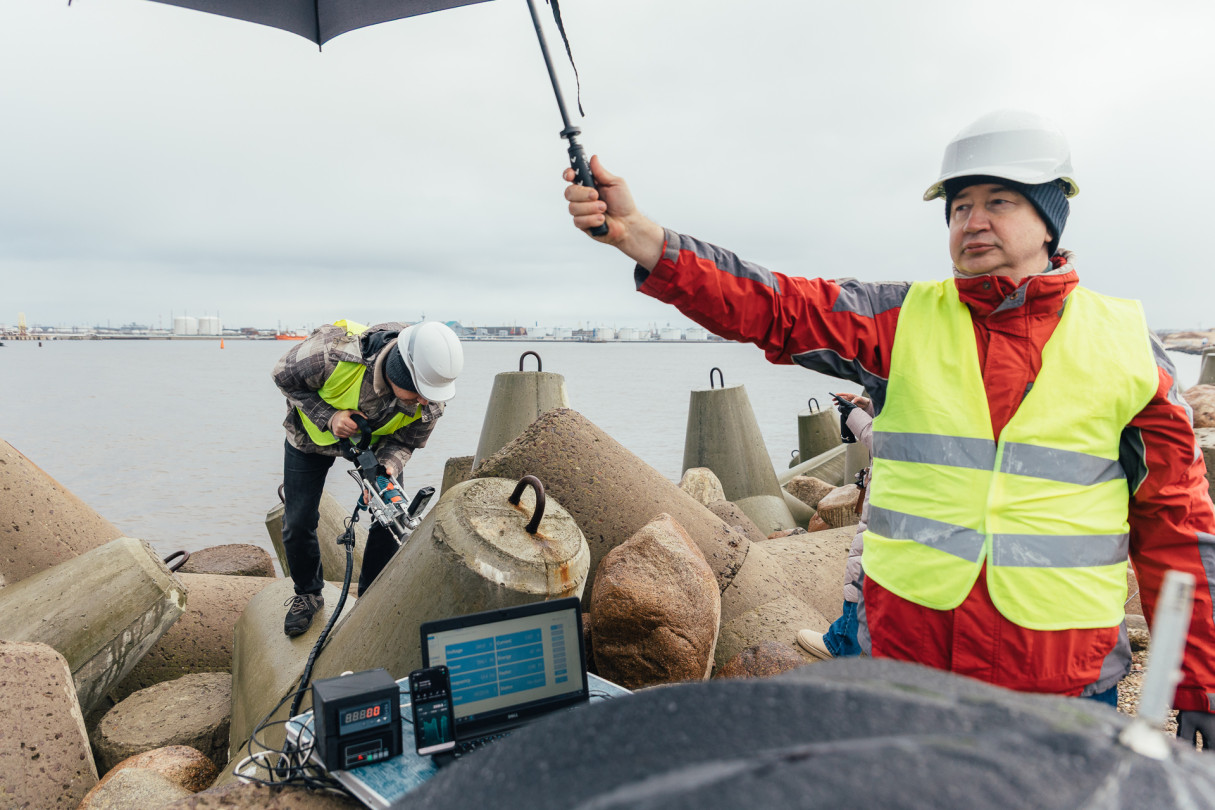 RTU pētnieki veic betona testēšanu dienvidu mola tetrapodiem