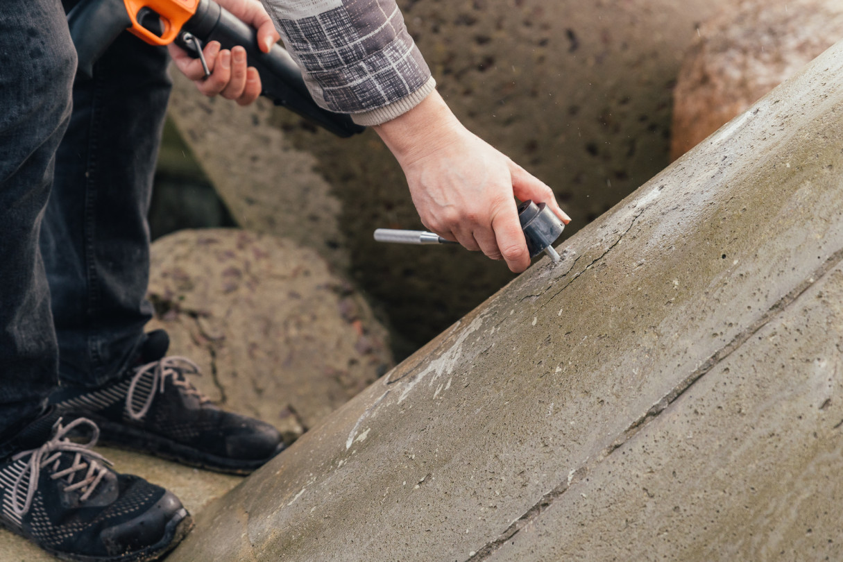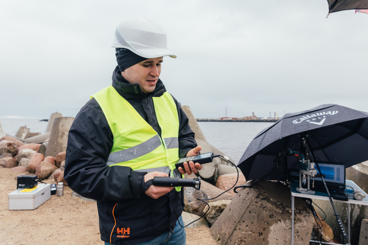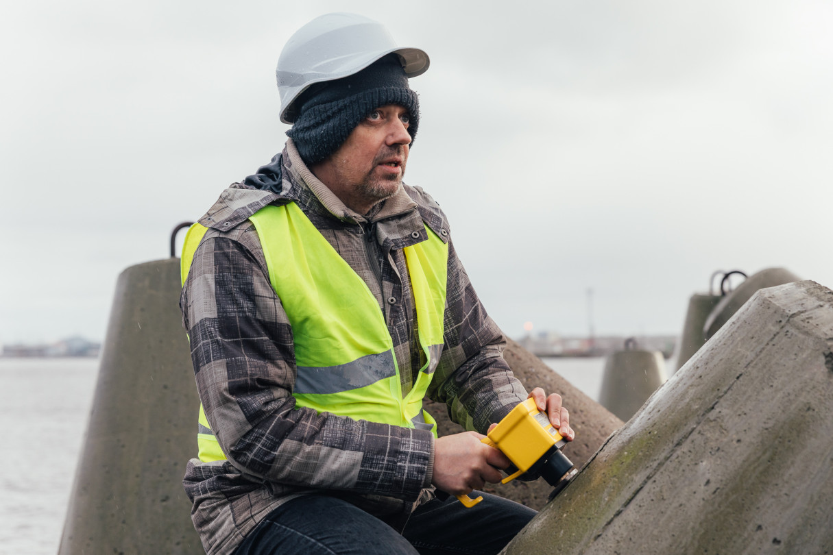 RTU pētnieki veic betona testēšanu dienvidu mola tetrapodiem