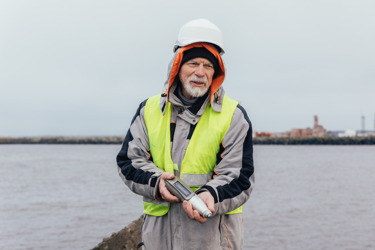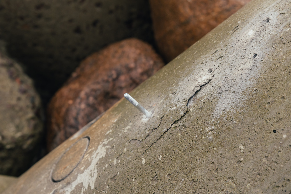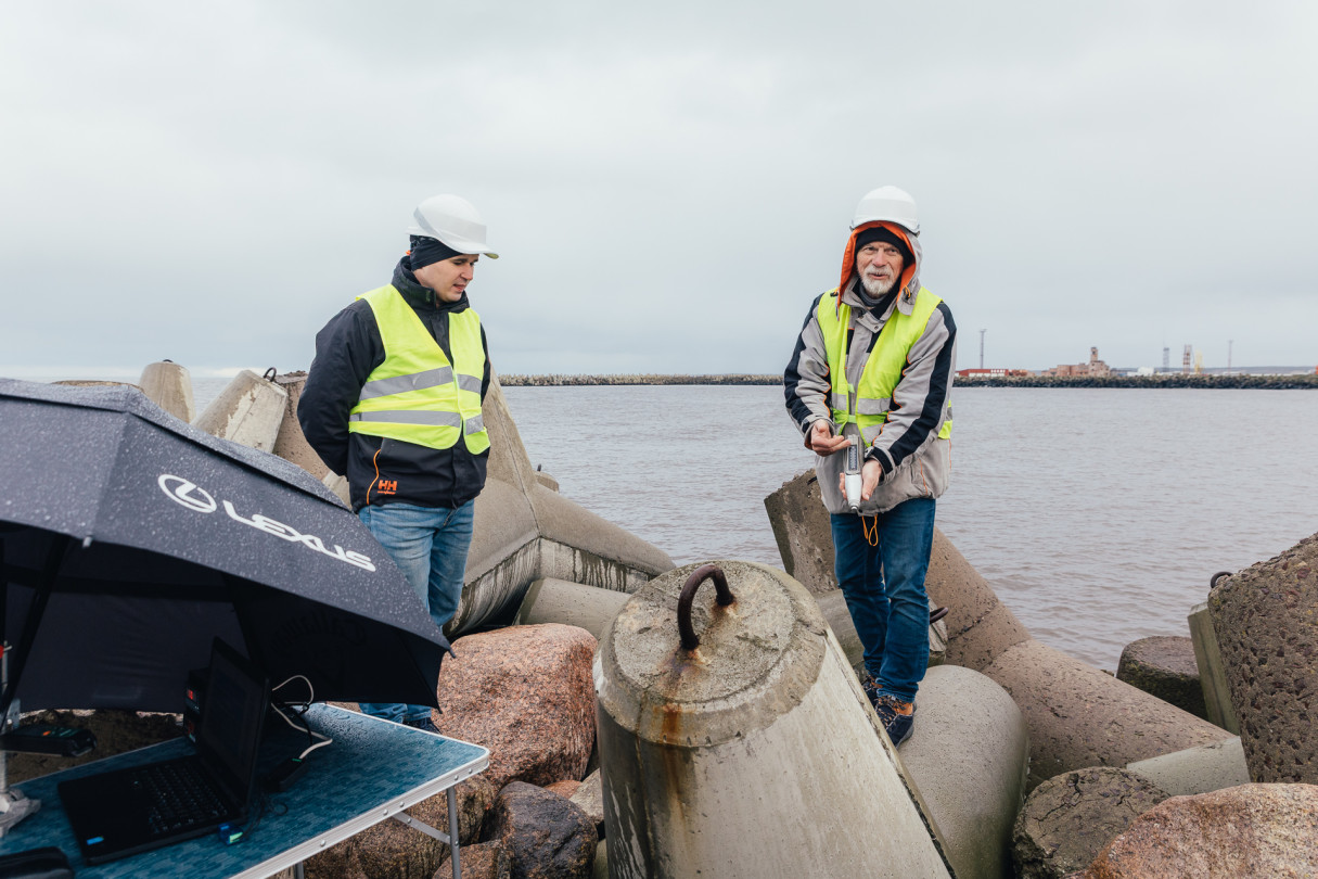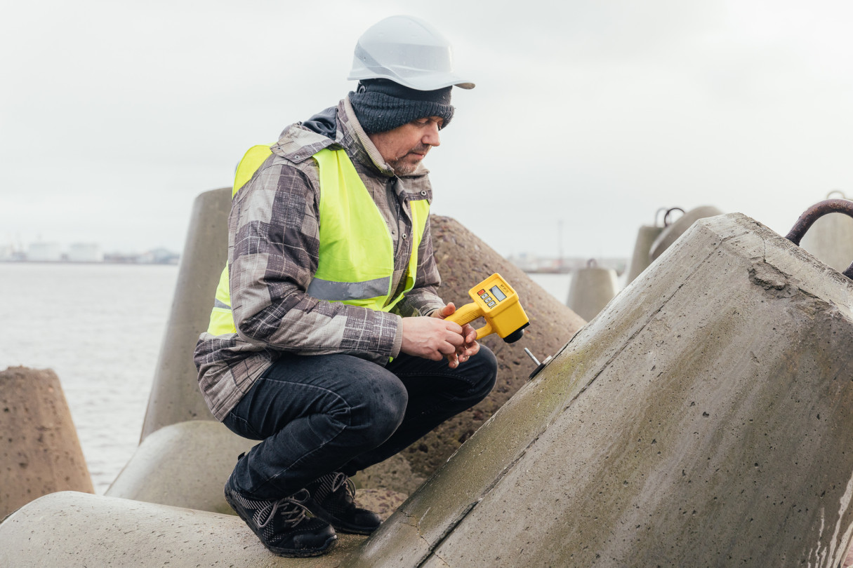RTU pētnieki veic betona testēšanu dienvidu mola tetrapodiem