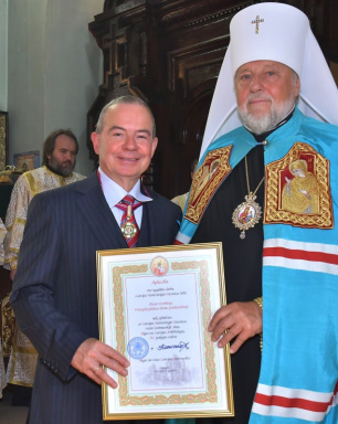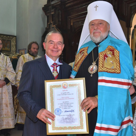 Latvijas Metropolīts pasniedz ordeni Aivaram Lembergam. Foto Aivars Ķesteris