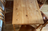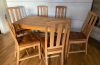 Komplekts sastāv no priedeskoka galda 120x75x74 un sešiem priedeskoka krēsliem, sēdeklis apvilkts ar ādu. Sēdekļa augstums 48 cm, atzveltnes augstums 96 cm. Normāls nolietojums.150 eiro.