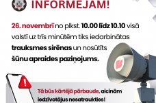 Lai pārbaudītu valsts agrīnās brīdināšanas sistēmas darbību, trešdien, 26.novembrī, no plkst. 10.00 līdz plkst. 10.10 Valsts ugunsdzēsības un glābšanas dienests (VUGD) visā valstī uz trīs minūtēm iedarbinās trauksmes sirēnas un uz iedzīvotāju viedtālruņiem nosūtīs šūnu apraides paziņojumu par trauksmes sirēnu iedarbināšanas iemeslu.