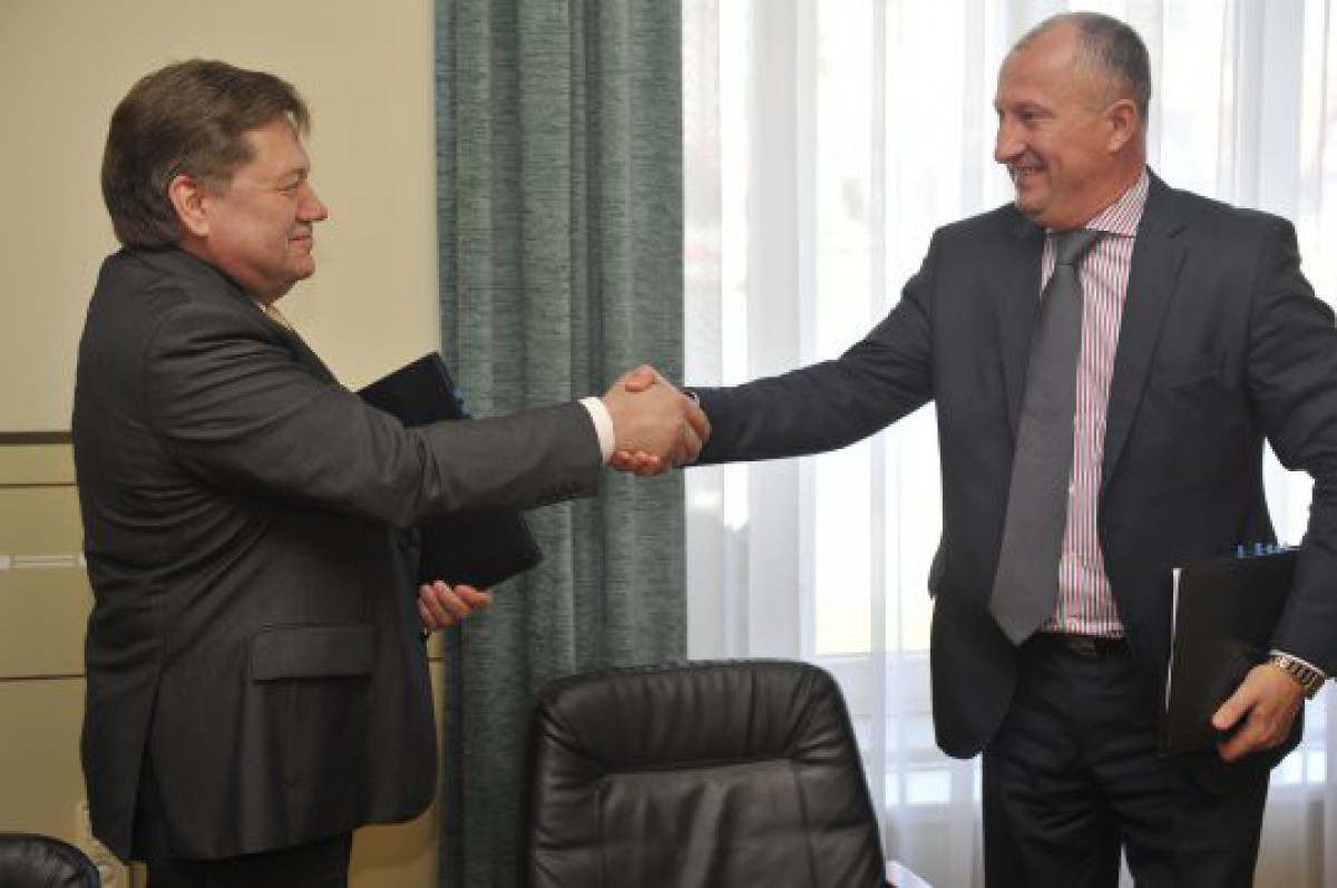 Foto:Celtniecības līgumu parakstīja Ventspils brīvostas pārvaldnieks Imants Sarmulis un AS BMGS valdes loceklis Genadijs Kalaneps.