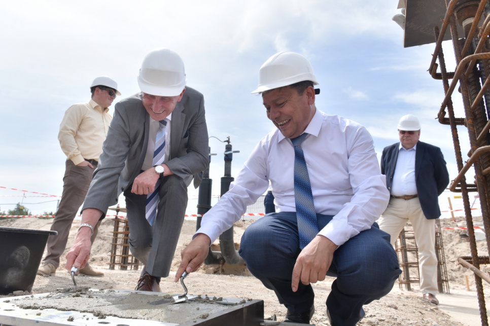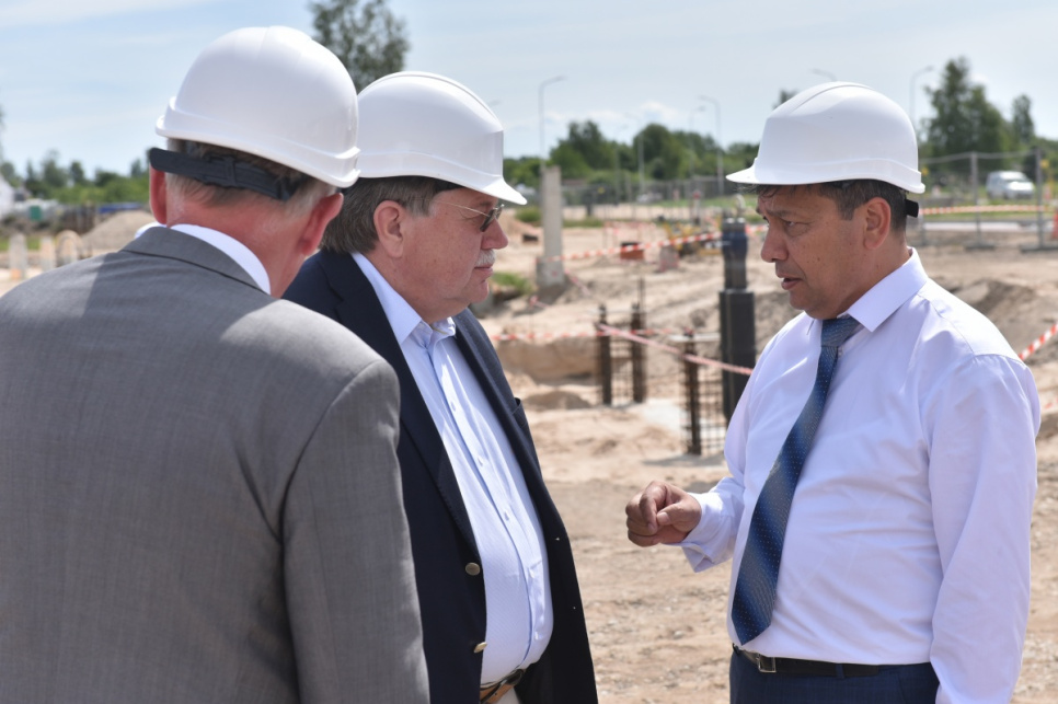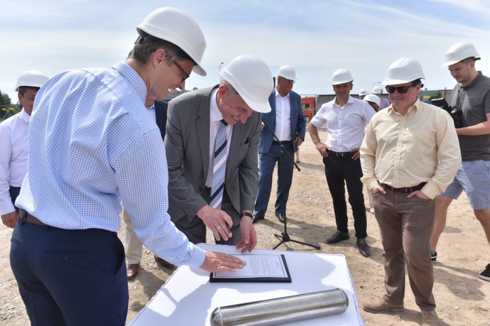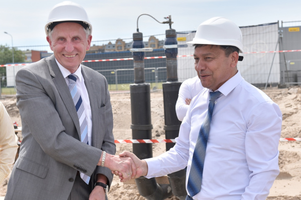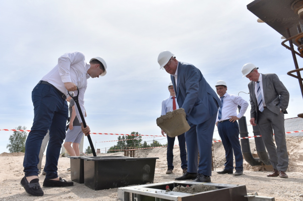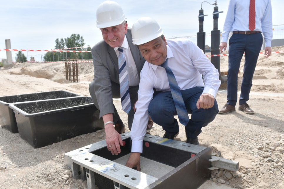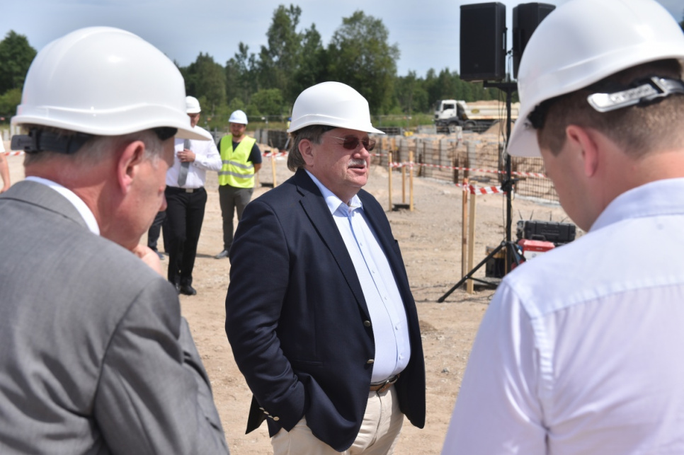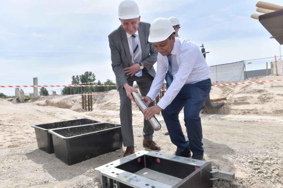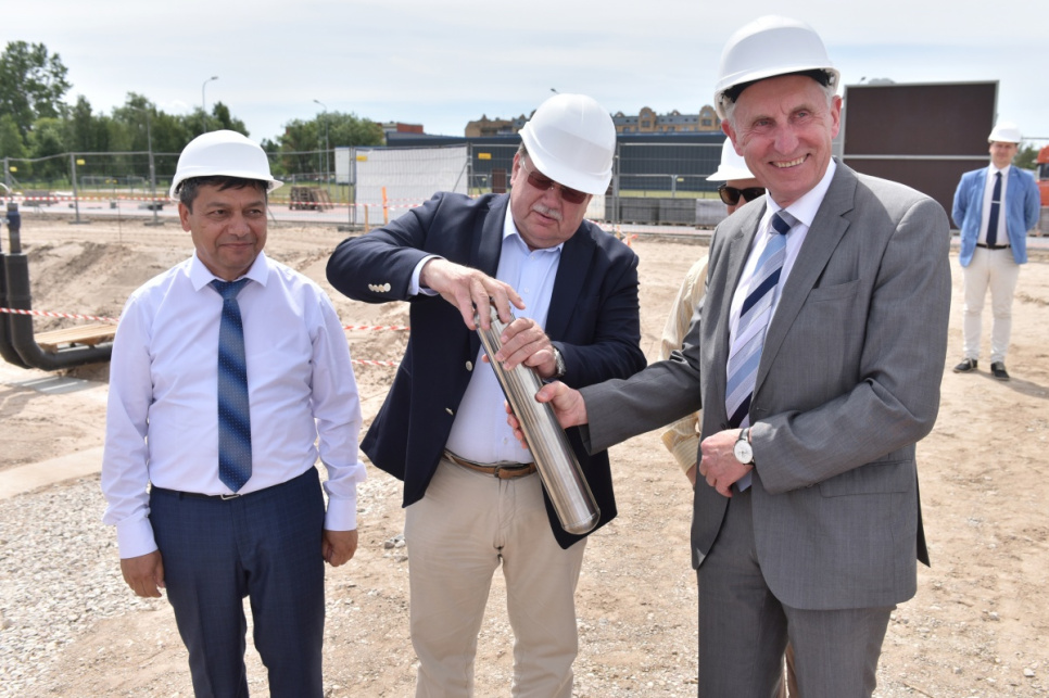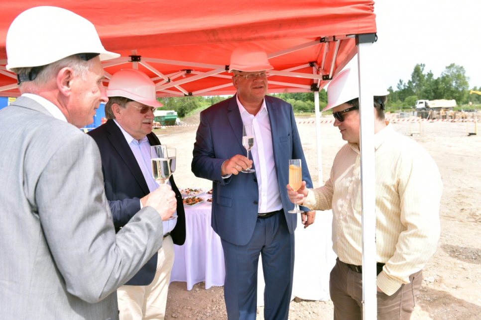 Ceremonijas dalībnieki kapsulas iemūrēšanā ēkas nr. 6 pamatos VATP teritorijā.