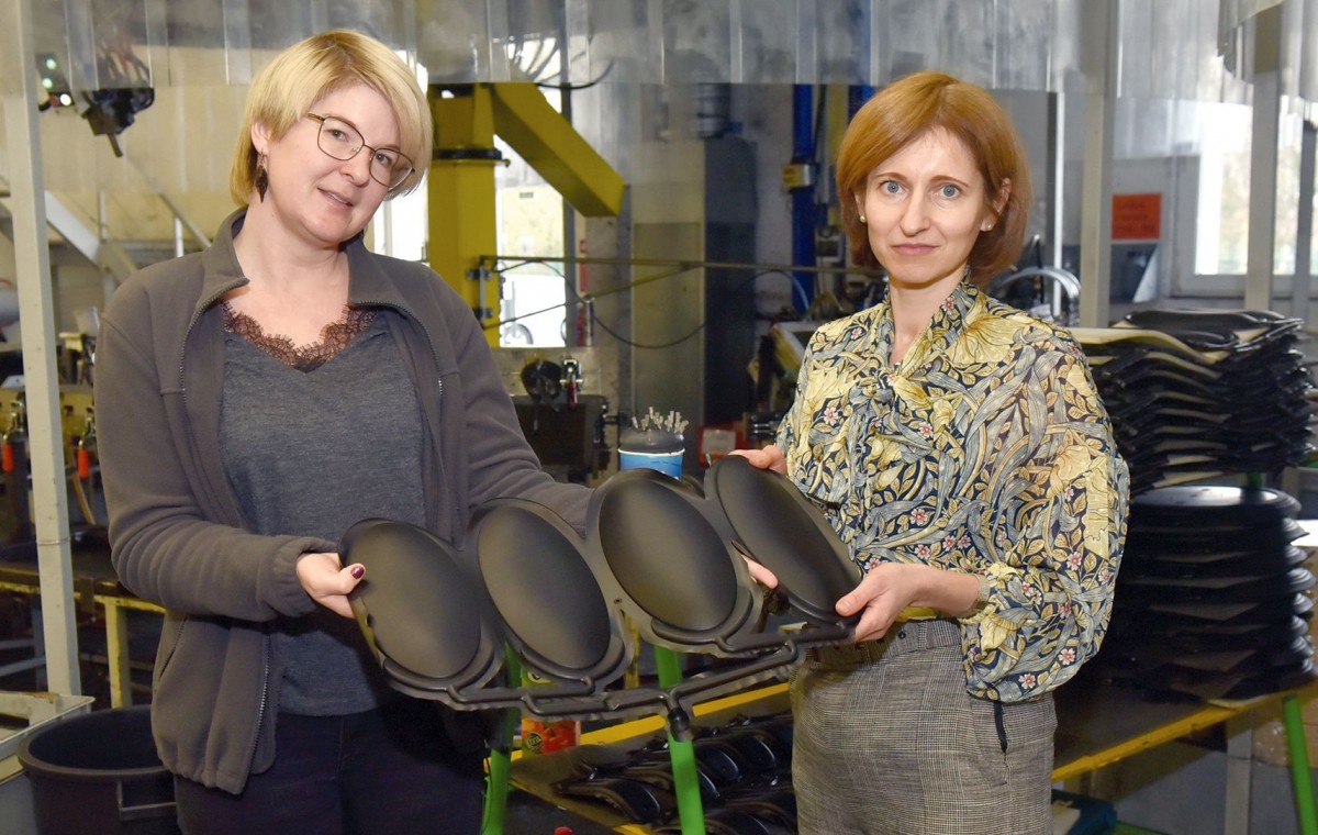 Alicija Voroņecka (no labās) un Ketija Boitmane rāda gaatvo detaļu, kas tikko izņemta no preses formas.