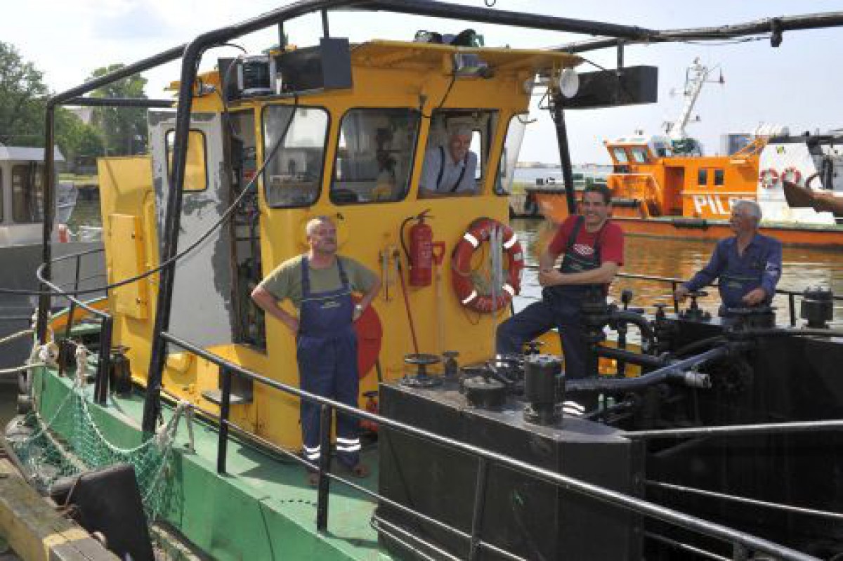 Foto: Likvidēt piesārņojumu ostā jebkurā mirklī gatavas doties naftas savācējkuģu komandas – (no kreisās) Pjotrs Moļiboga, Andris Heibergs, Aristids Remerts un Agris Šķeris.