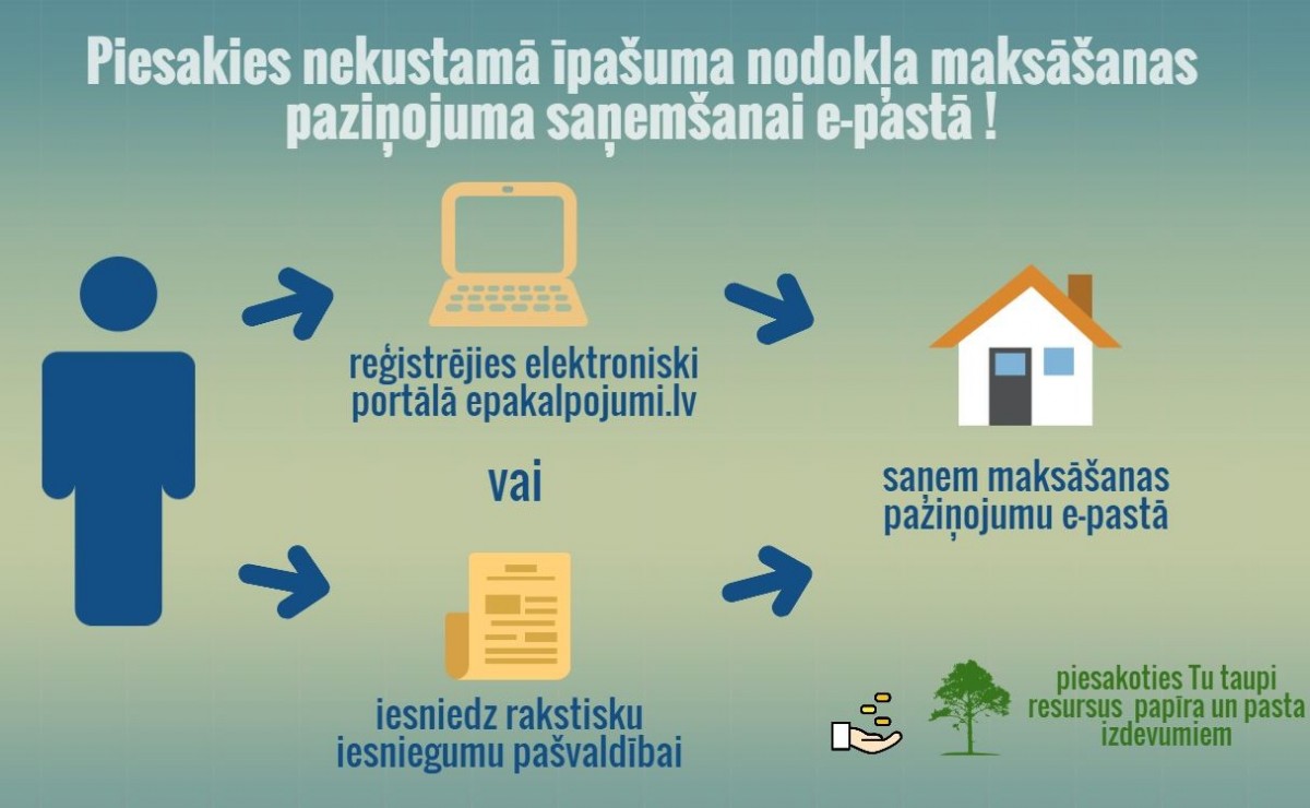 Reģistrējoties portālā www.epakalpojumi.lv (sadaļa «Nekustamā īpašums/Mans nekustamā īpašuma nodoklis”), kas nodrošina ērtu maksājumu veikšanu, sniedz iespēju apskatīt un izdrukāt nodokļa maksāšanas paziņojumus.