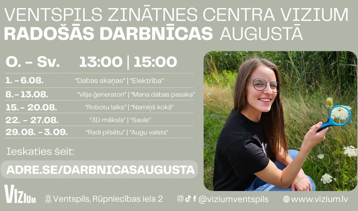 Jauns mēnesis Ventspils zinātnes centrā VIZIUM nāk ar jaunām tehniski radošajām darbnīcām, kas augustā būs veltītas dabas tēmai. Darbnīcu apmeklētājiem būs iespēja ieklausīties augļu un dārzeņu skaņās, izveidot savu pilsētu, iepazīt dažādus augus un vēja enerģiju, izprast Sauli un ne tikai!