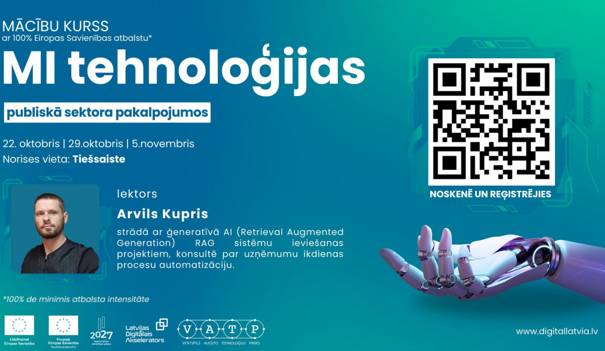 Ventspils Augsto tehnoloģiju parks, kā Eiropas Digitālā inovācijas centra biedrības "Latvijas Digitālais akselerators" kontaktpunkts, aicina publiskā sektora iestādes pieteikties apmācību kursam "MI tehnoloģijas publiskā sektora pakalpojumos" ar 100% Eiropas Savienības līdzfinansējumu*.