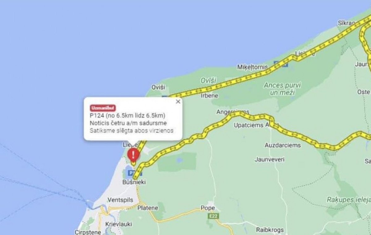 Sestdien ap plkst.21 Ventspils novadā, Tārgales pagastā, uz autoceļa Ventspils-Kolka (P124) pagaidām nenoskaidrotos apstākļos notika sadursme starp četrām automašīnām - trīs "Audi" markas automašīnas un viena "BMW".