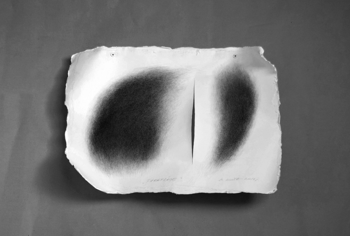 Šai gadījumā viens ir līmēta papīra forma, kas ir pilnīgi pašpietiekamaun ir raksturīga vairāk tekstilmākslai, tēlniecībai. Un otrs ir teksturēts tušas štrihojums - arī pašpietiekams. Tas ir minimālistisks, tonāls, un ir pielīdzināms grafikai. Primāra tomēr ir papīra forma, zīmējums vairāk vai mazāk tai pielāgojas. Šajā divu mēdiju simbiozē ideja vai nu tiek pilnīgota vai izmainīta. (Mārīte Kluša)