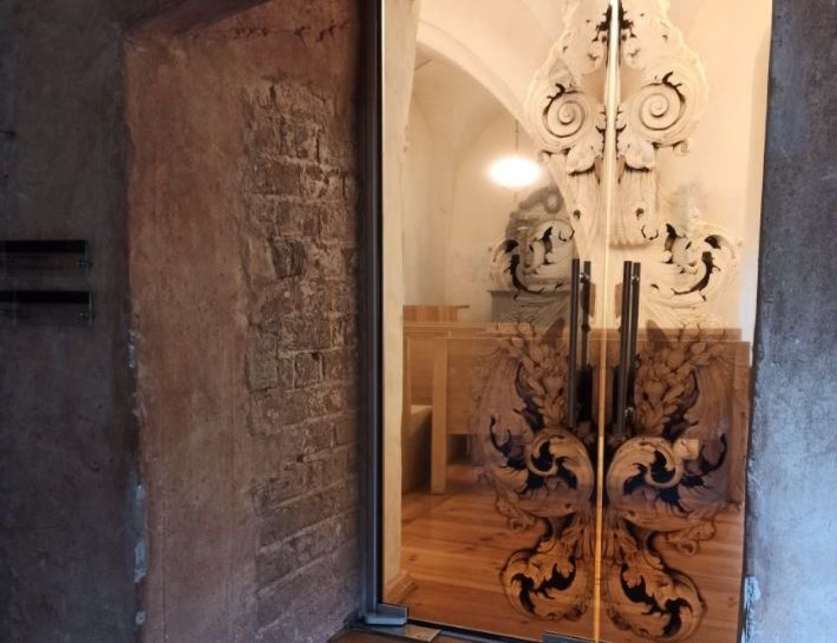 Livonijas ordeņa pils kapelai atgriezušās stikla durvis jaunā veidolā, - durvju attēliem izmantots Ventspils koktēlnieku darbnīcas altāra un kanceles vienas kokgriezuma detaļas elements.