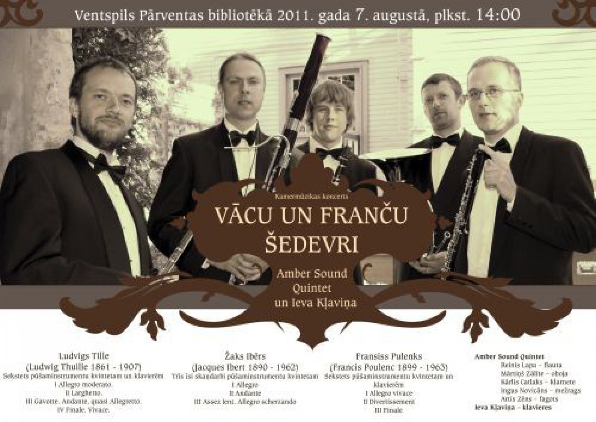 Svētdien plkst. 14 Pārventas bibliotēkā notiks kamermūzikas koncerts "Vācu un franču mūzikas šedevri". Muzicēs Liepājas simfoniskā orķestra koka pūšamo instrumentu ansamblis Amber Sound Quintet un Ieva Kļaviņa (klavieres).
