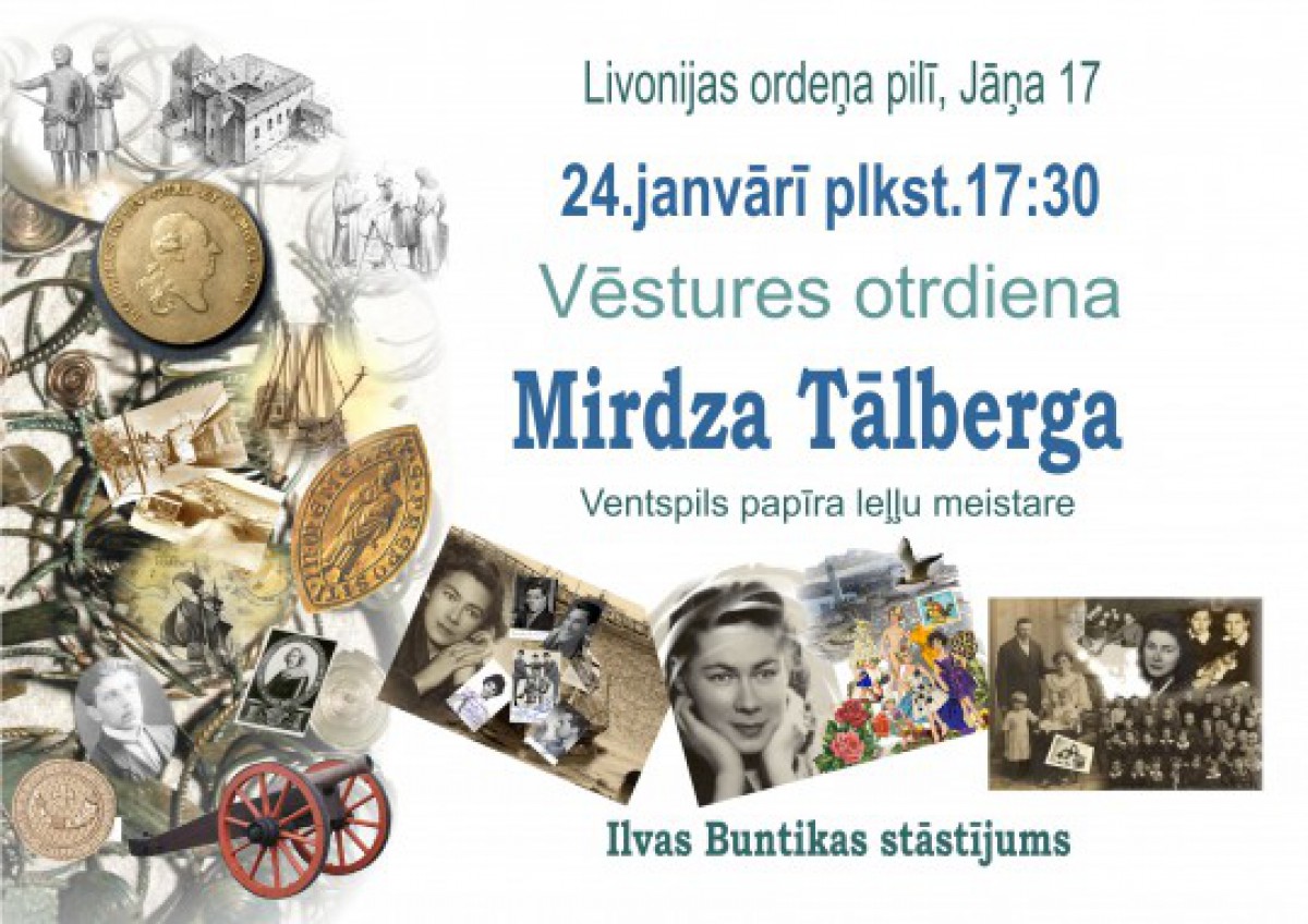 Otrdien, 24. janvārī plkst. 17:30 Vēstures otrdiena Livonijas ordeņa pilī, stāstījums par Mirdzu Tālbergu - Ventspils papīra leļļu meistari, stāsta - Ilva Buntika.