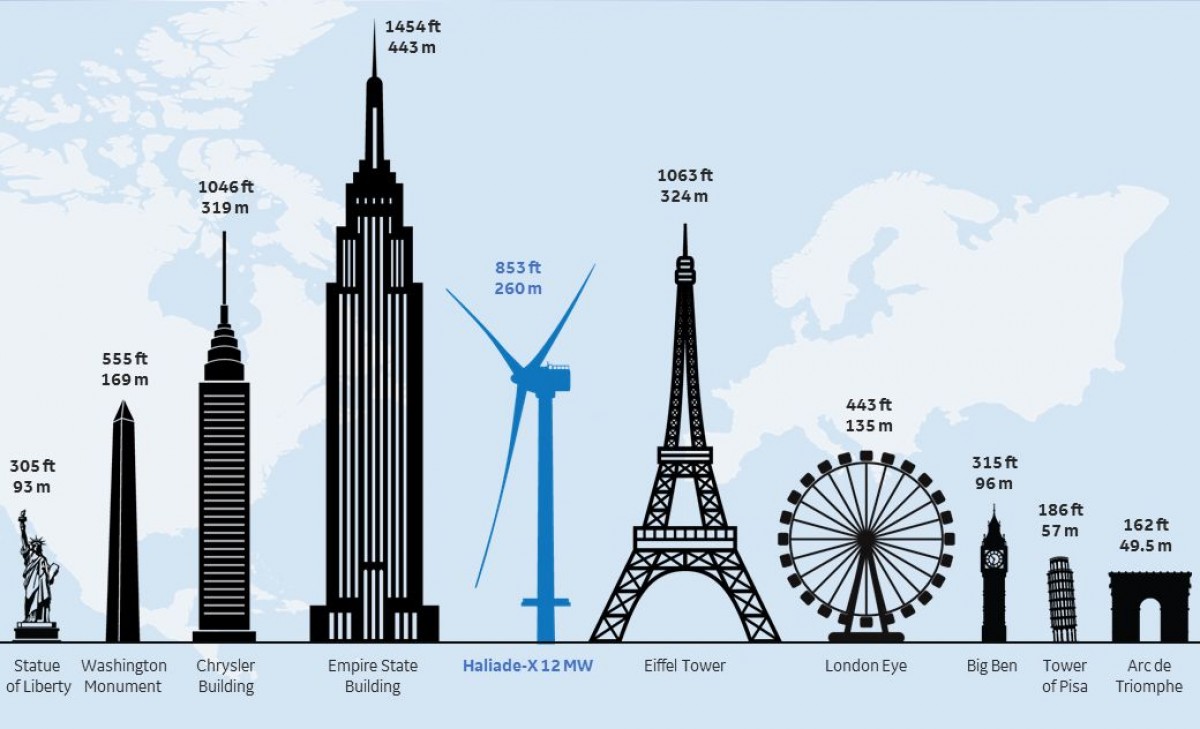 Foto: 260 metrus augstas vēja turbīnas salīdzinājums ar pasaulē populāriem objektiem. Popē iecerēts būvēt četrus 240 metrus augstus vēja ģeneratorus.