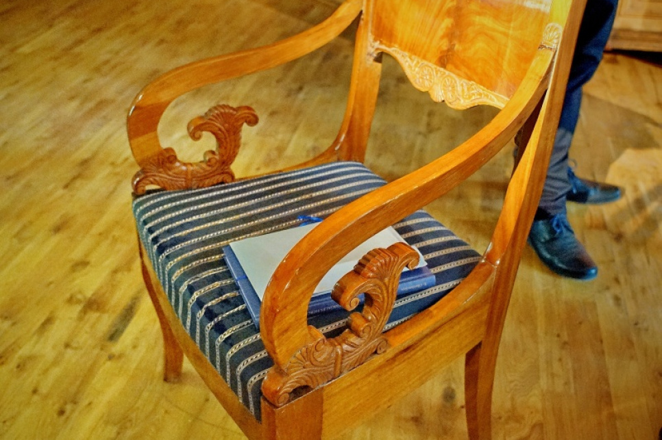 Šī pasākuma sakarā noteikti jāpiemin vēl kāds būtisks Popes muižas ieguvums. Saņemot uzaicinājumu ierasties uz Gadsimta atgriešanos II Popes muižā, Inguna Birzniece, kurai nu jau piecus gadus bijusi iespēja sadarboties ar restauratoru Aigaru Pilenieku, pieņēmusi spontānu lēmumu skaisti lakoto Bīdermeijera krēslu, kas viņas interjerā īsti nav iederējies, uzdāvināt Popes muižai. Zinādama par Popes muižas telpām, kurās vēl aizvien saglabājies oriģinālais sienu panelējums, viņa sapratusi, ka šādas Bīdermeijera mēbeles noteikti savulaik bijušas arī šajā interjerā. Turklāt Popes muižas īpašumā jau ir šāda stila galdiņš. Ar vēlējumu šo 19. gs. laikmetam raksturīgo mēbeļu ansambli kādreiz papildināt ar vēl kādu elementu, Birzniece krēslu nodeva Popes muižai. Dāvana ar prieku tika saņemta, un Roberts Grinbergs minēja, ka arī restaurators Pilenieks atzinīgi izteicies par krēsla kvalitāti un unikalitāti, tādēļ šis krēsls ir kā nākamais solis uz iespēju atgriezt senajai muižai un telpām senāko godību.
