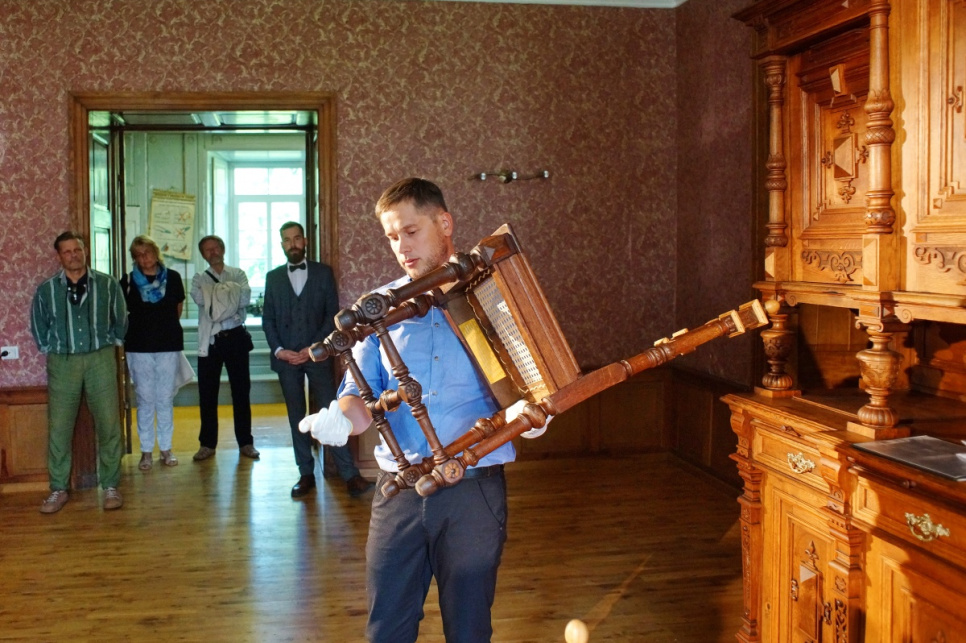 Šie un vēl astoņi historisma stila ēdamzāles krēsli redzami 20. gadsimta sākumā fiksētajos Popes muižas iekštelpu fotouzņēmumos. Turpat, Popes muižas pirmā stāva anfilādes otrajā galā, divi ēdamzāles krēsli vairāku šī svinīgā notikuma liecinieku klātbūtnē piedzīvoja atdzimšanu jeb, kā to nodēvēja pasākuma organizatori – Gadsimta atgriešanos II.