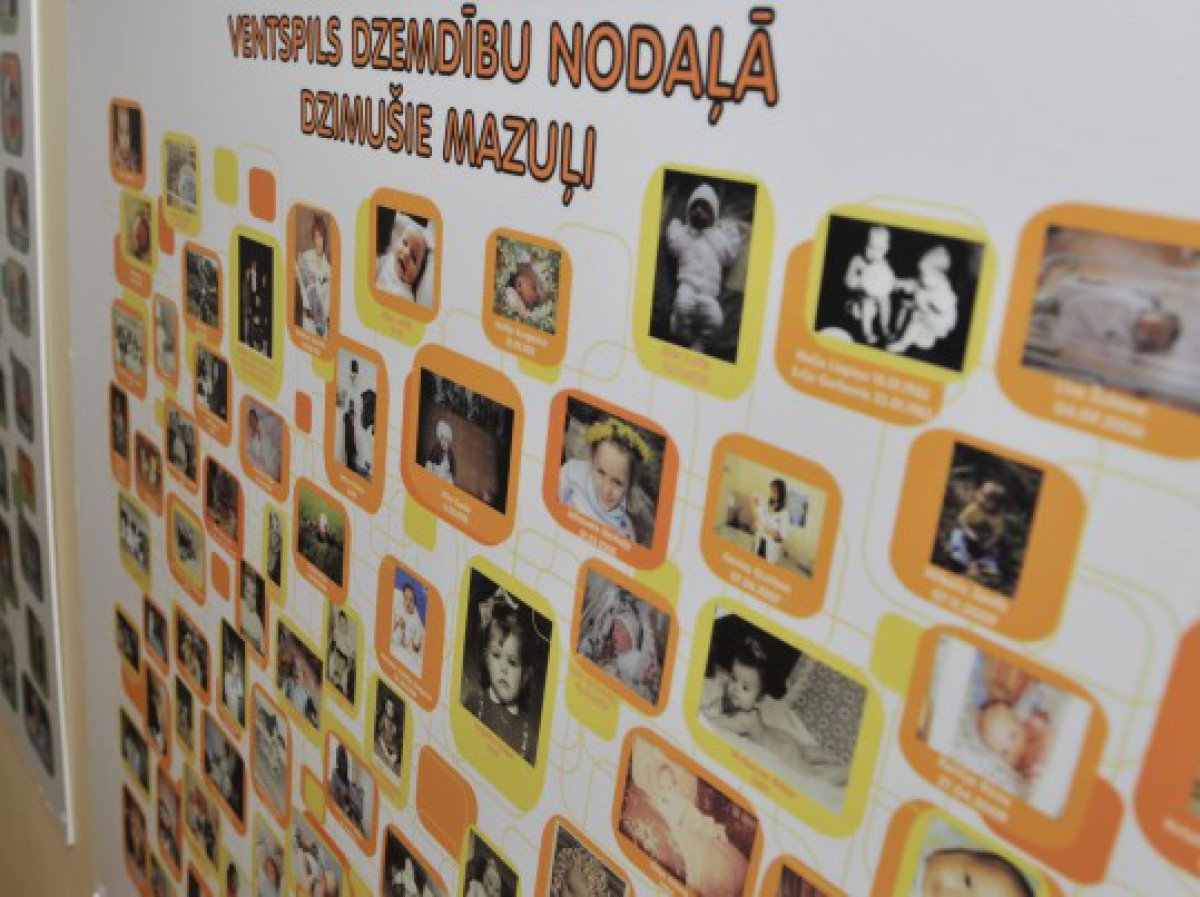 Foto paraksts: Ziemeļkurzemes reģionālās slimnīcas dzemdību nodaļas uzgaidāmās telpas sienu rotā slimnīcā dzimušo bērniņu bildītes. Šogad jauno ventspilnieku vecāki saņems pašvaldības dāvanu – bērna piedzimšanas pabalstu.