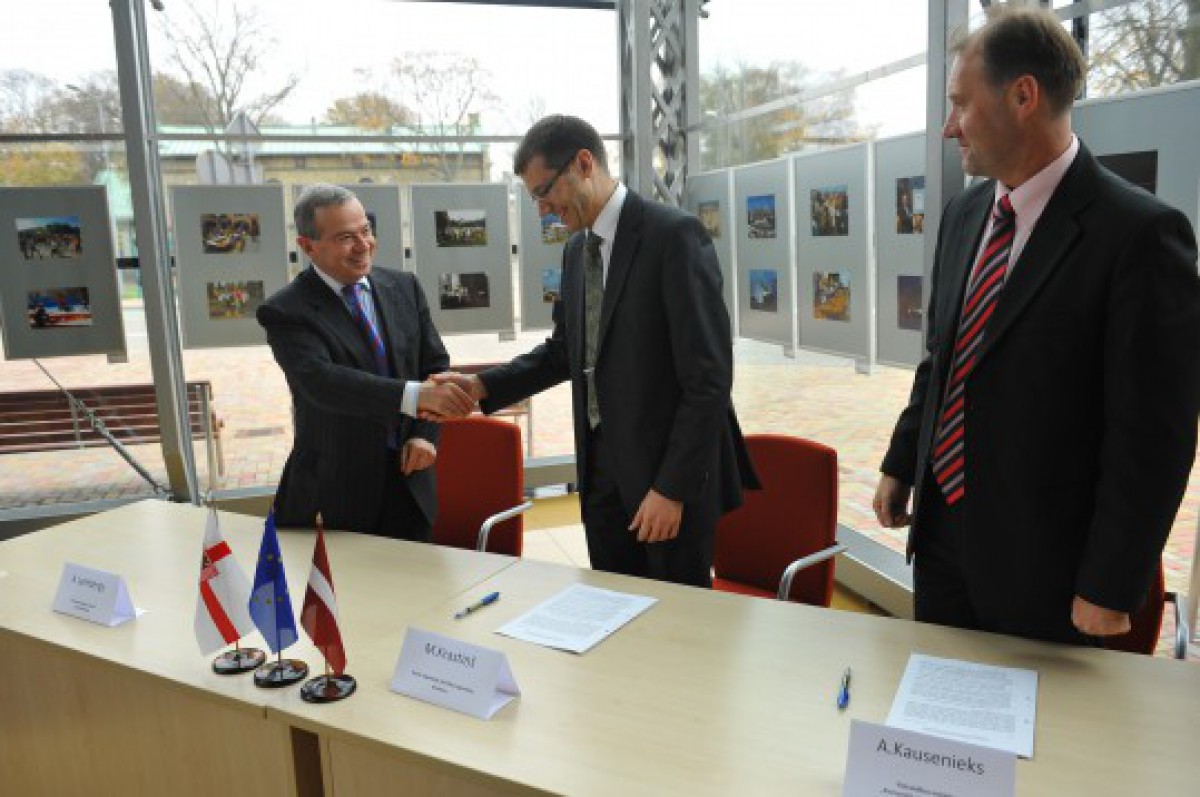 Foto: Valsts Reģionālās attīstības aģentūras direktors Māris Krastiņš (vidū) un Komunālās pārvaldes direktors Andris Kausenieks pilsētas mēra Aivara Lemberga klātbūtnē paraksta vienošanos.