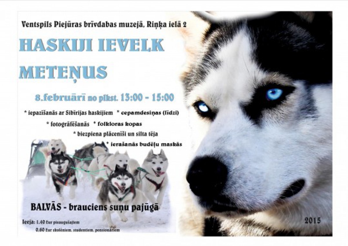 Piejūras brīvdabas muzejā svētdien viesosies Haskiju parks no Zirām! Varēs braukt haskiju pajūgā vai sniega motocikla kamanās, protams, ja būs sniegs. Sniega suņus drīkstēs fotografēt, kā arī atbildot pareizi uz 12 viktorīnas jautājumiem par Sibīrijas haskijiem, balvā tiks bezmaksas brauciens haskiju pajūgā.