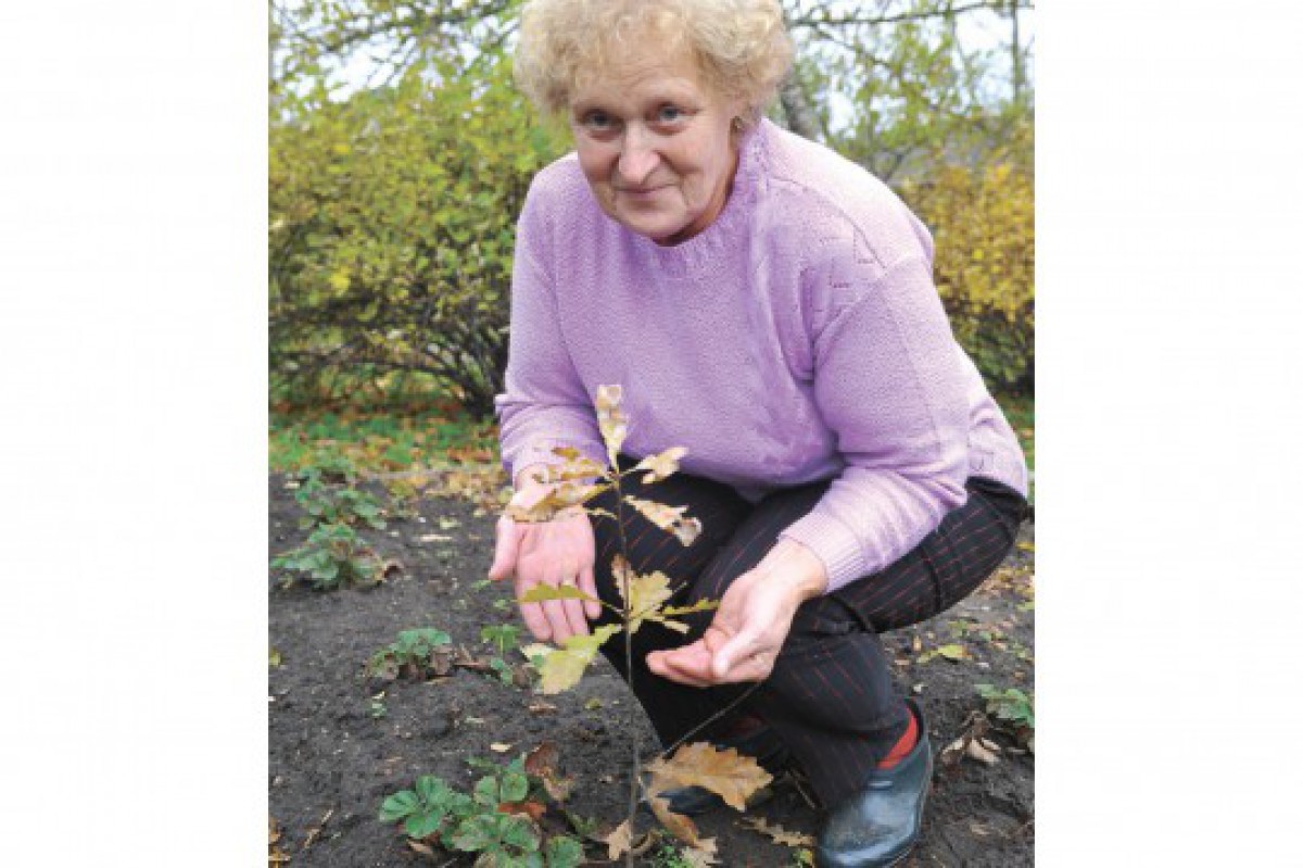 Marta Kanniņa apmīļo ozolu, kas izaudzis no Ventas Balss dāvinātās zīles.