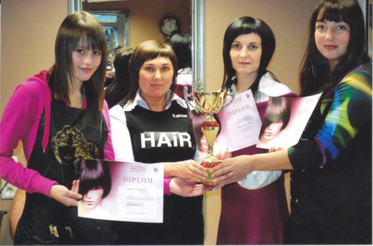Foto: Ventspils frizieres (no kreisās pa labi) Nataļja Propustina, Tamāra Jacukeviča, Kristīna Kacalapova un Jeļena Skoromnaja saņēma trešās pakāpes diplomu frizierus skolas konkursā Hair Styling Festival 2010.