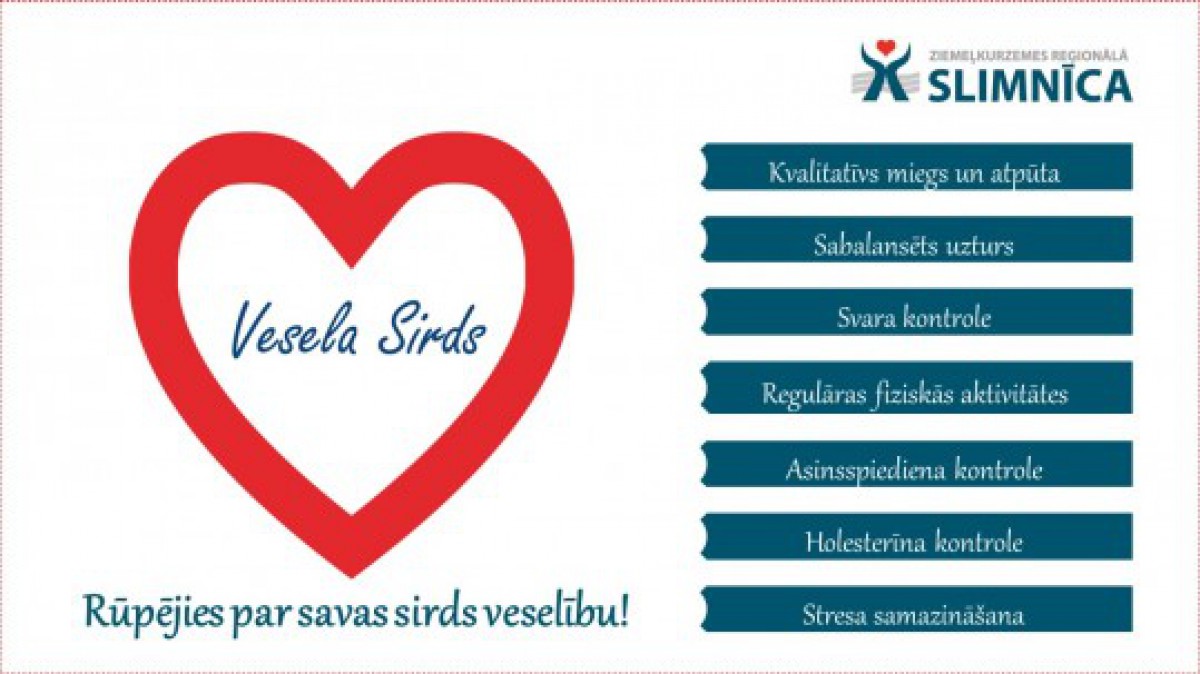 SIA „Ziemeļkurzemes reģionālās slimnīcas” kardioloģijas nodaļa aicina izturēties atbildīgi pret savas sirds veselību un atgādina, ka veselas sirds noslēpums ir rūpes par to visa mūža garumā!Lai mūsu sirdis būtu stipras un veselas!