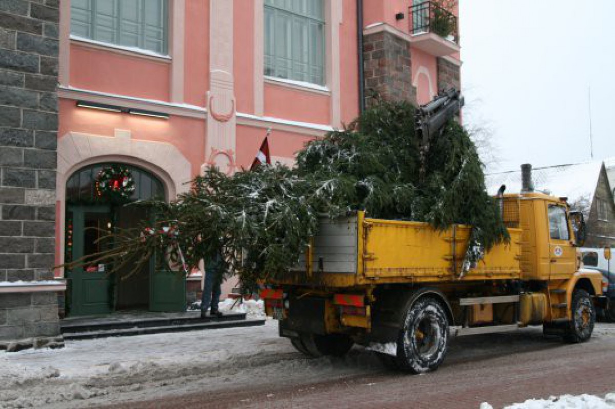 Varens svētku egles sagādāšanas pasākums izvērsās Jaunrades namā, kur egles nogādāšanai zālē bija nepieciešams gan spēks, gan īpaša izdoma.