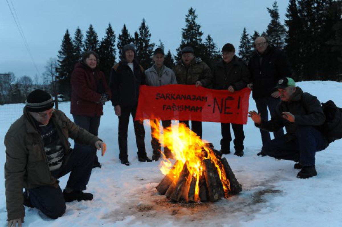 Foto: Ugālnieki, Rīgas aizstāvji, ar barikāžu laiku transparentu.