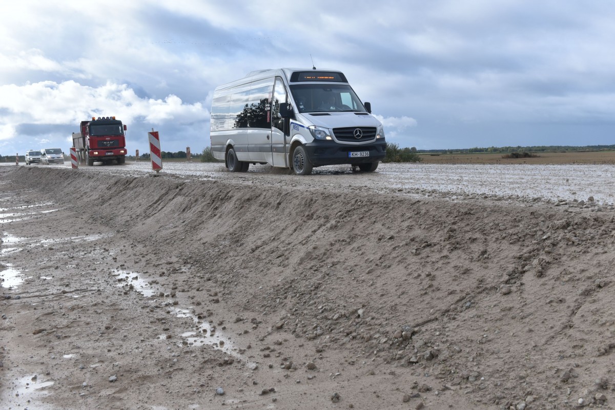 Lielas neērtības autovadītājiem sagādā bedrainie grantētā ceļa posmi uz Ventspils–Kuldīgas šosejas. Būvnieki ir sodīti, un tiek solīts līdz ziemai visu sakārtot.