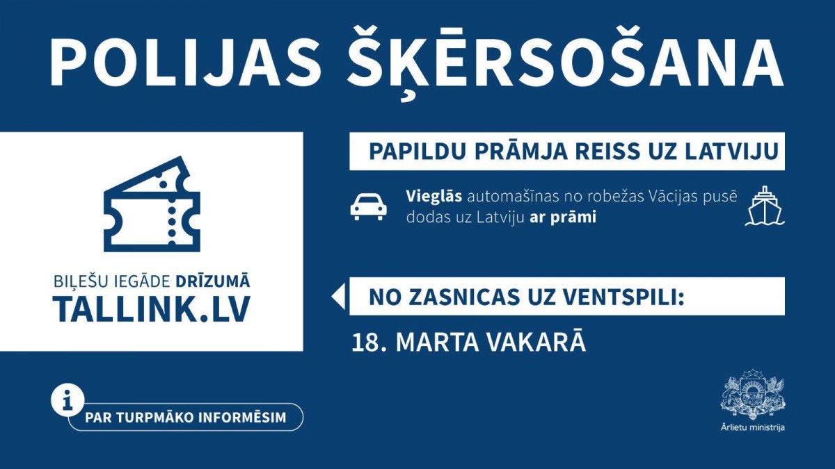 Ārlietu ministrija ziņo, ka 18. marta vakarā no Vācijas ostas Zasnicā uz Ventspili izbrauks vēl viens prāmis, ar kuru mājās varēs nokļūt tie, kas iestrēguši uz Polijas robežas.
