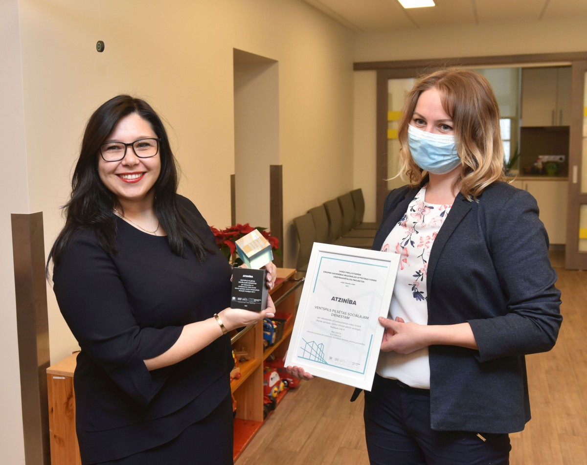 Par to otrdien Ventspils Sociālajam dienestam tika pasniegta atzinības balva. «Labklājības ministrija sadarbībā ar Latvijas Cilvēku ar īpašām vajadzībām sadarbības organizāciju SUSTENTO apsekoja objektus, kas īstenoti ar Eiropas Sociālā fonda atbalstu, un pēc noteiktiem kritērijiem atlasīja Latvijā 15 labās prakses līderus. Ventspils Sociālais dienests ir viens no šiem līderiem, un mēs Labklājības ministrijas vārdā pasniedzam šo apbalvojumu,» skaidro izdevniecības Dienas mediji pārstāve Santa Butāne. Viens no galvenajiem vērtēšanas kritērijiem bija – ieviestie risinājumi vides pieejamības nodrošināšanā.