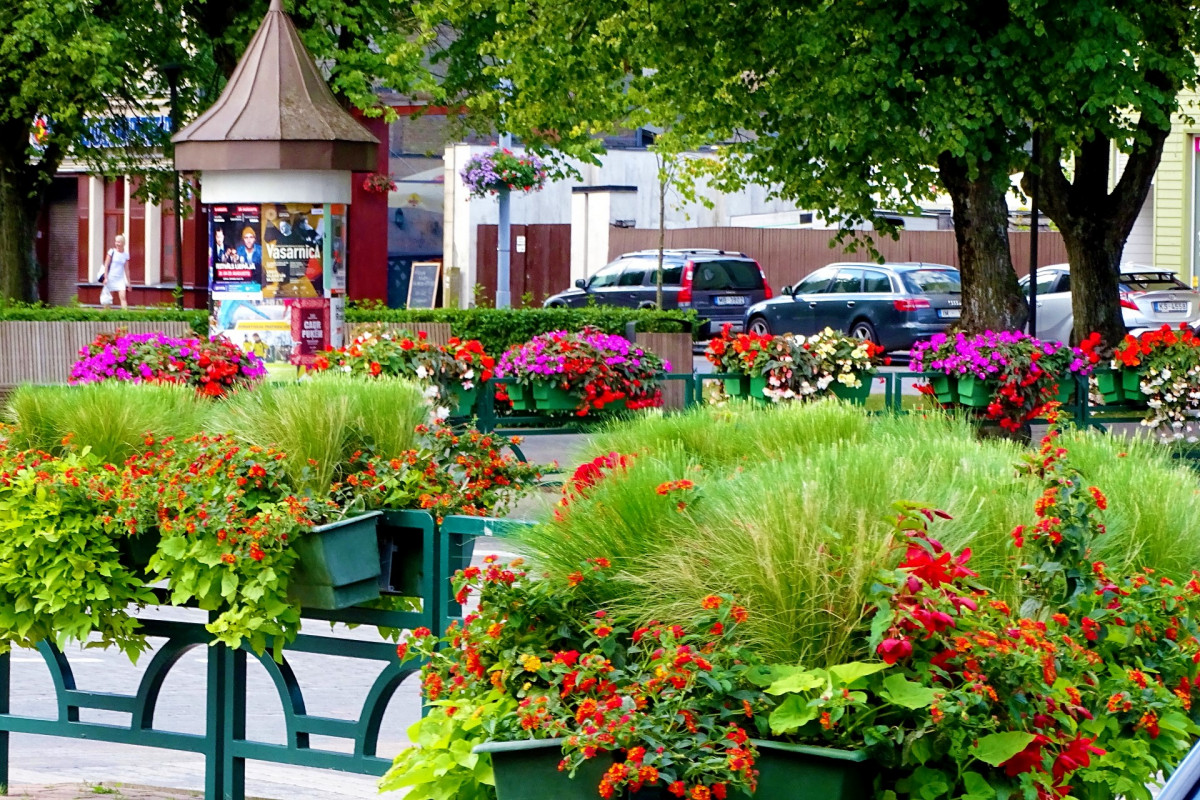 Puķu dobes visā pilsētā;