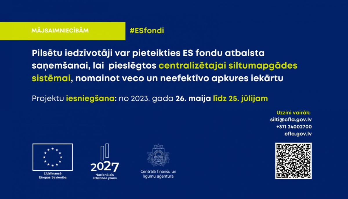 Gaisa piesārņojumu mazinošu pasākumu īstenošanai, Centrālā finanšu un līgumu aģentūra (CFLA) ir izsludinājusi atklātu projektu atlasi par Eiropas Savienības (ES) fondu atbalstu centralizētās siltumapgādes pieslēgumu ierīkošanai dzīvojamajās mājās.