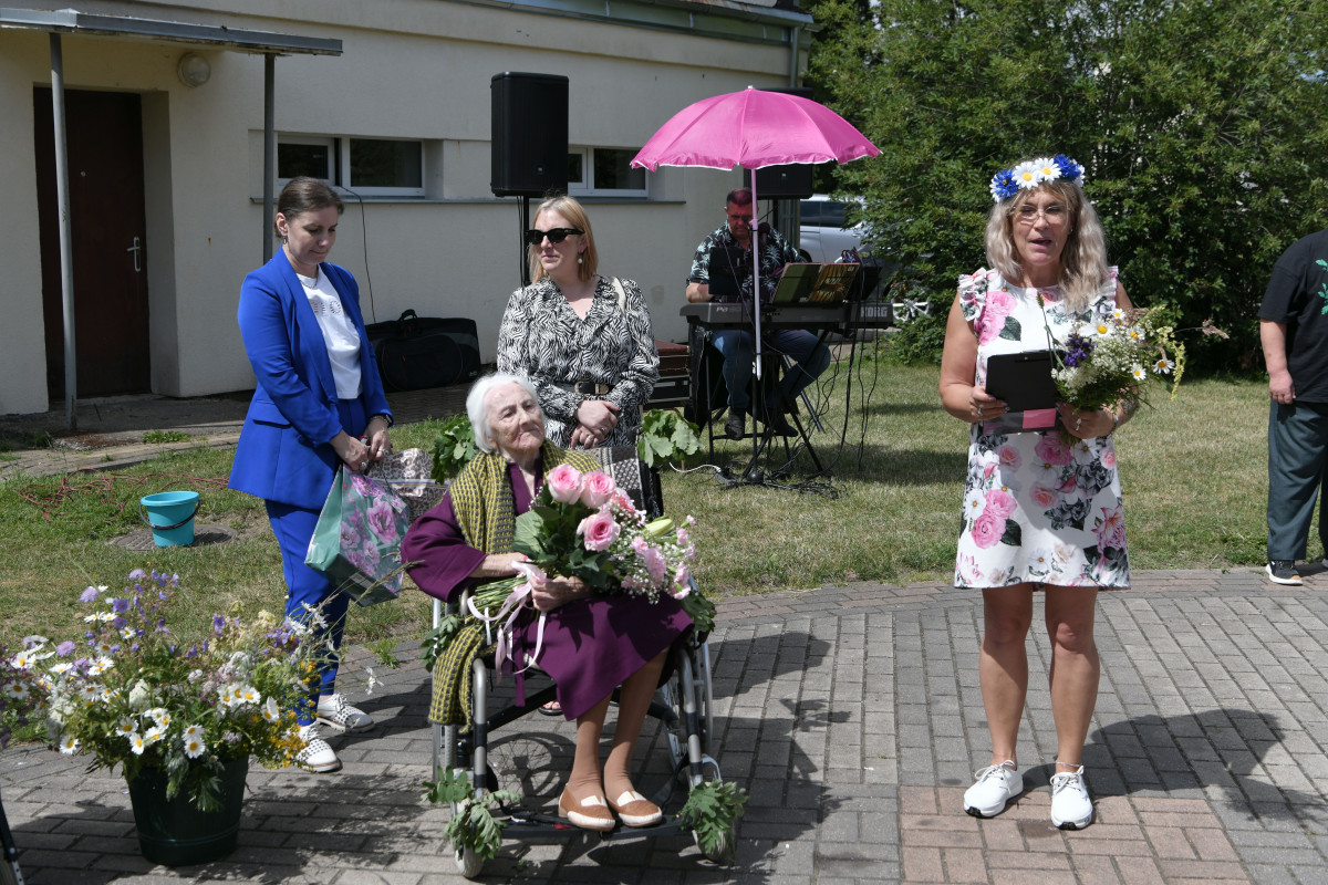 21. jūnija pēcpusdienā Ventspils Senioru aprūpes nama Selga pagalmā ikdienas rimto dzīvi saviļņoja priecīgs notikums – pašvaldība un aprūpes nama darbinieki Selgas iemītniekiem bija sarūpējuši lustīgu svētku ielīgošanas pasākumu ar dziesmām, dejām, gardiem tradicionālajiem svētku ēdieniem un dzērieniem. Taču pāri visam – vislielākais prieks par nama iemītnieces Mirdzas Stellas Putniņas simto dzimšanas dienu. Par godu šim skaistajam notikumam bija ne tikai sanākuši mājinieki, bet arī sabraukuši viesi. Tieši Mirdzas dzimšanas dienā bija atbraukusi vedekla, kā arī divas sirmgalves mazmeitas, kuras dzīvo Īrijā un ar kurām nemaz tik bieži redzēties nesanāk.