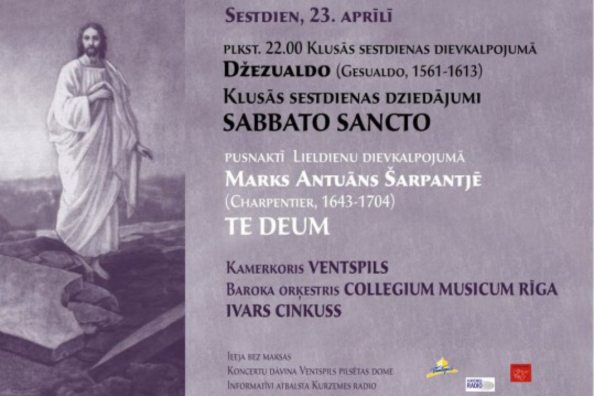 Ventspils Nikolaja evaņģēliski luteriskajā baznīcā sestdien, 23. aprīlī plkst. 22.00 skanēs Karlo Džezualdo (Gesualdo) - Sabatto Sancto un Marka Antuāna Šarpantjē (Charpentier) – Te Deum.