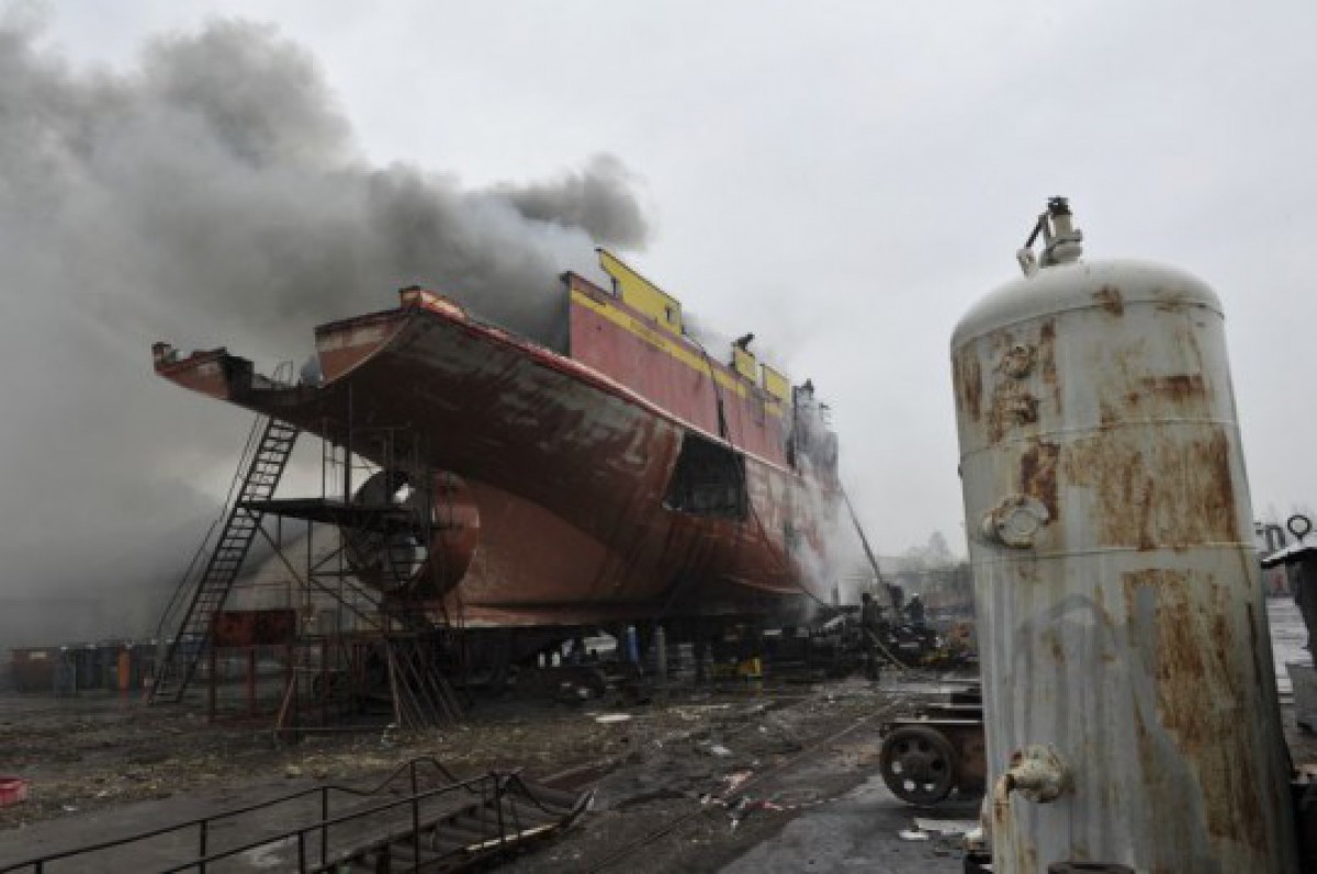 Ostgalu piedūmo aizdedzies kuģis (FOTO)