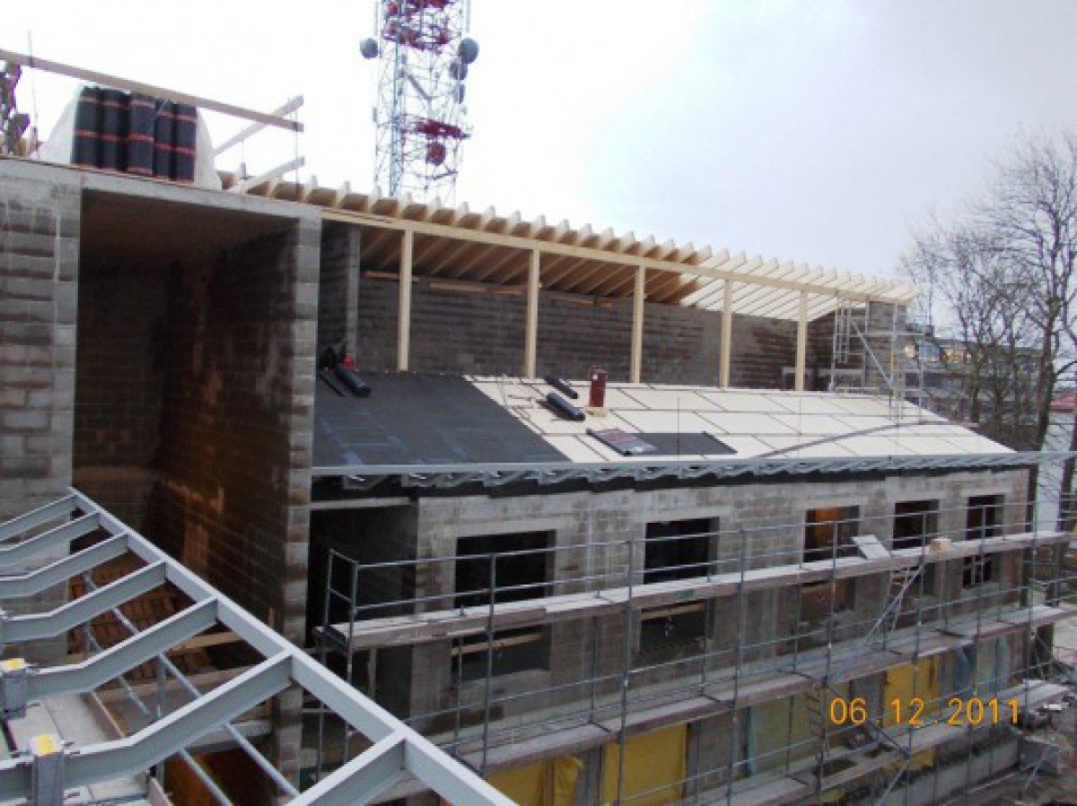 Ap jaunbūvi visapkārt saslietas stalažas, lai varētu veidot ēkas sienu siltinājuma karkasu. Uz jumta būvnieki jau ir uzsākuši "pīrāga" - unikāla siltinājuma slāņa izbūves darbus.