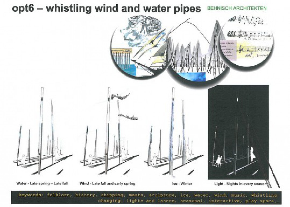 Idejas pamatā ir atainot kuģu mastus jahtu ostā, kur vienlaikus gan tecētu ūdens, gan masti būtu dažādu leņķu, materiālu un tamlīdzīgi, kā arī - ūdens varētu tecēt ziemā un masti apledotu, kā tas ir reālajā dzīvē, kuģojot pie zemas temperatūras, risinājuma veidolu aprakstīja Lembergs.