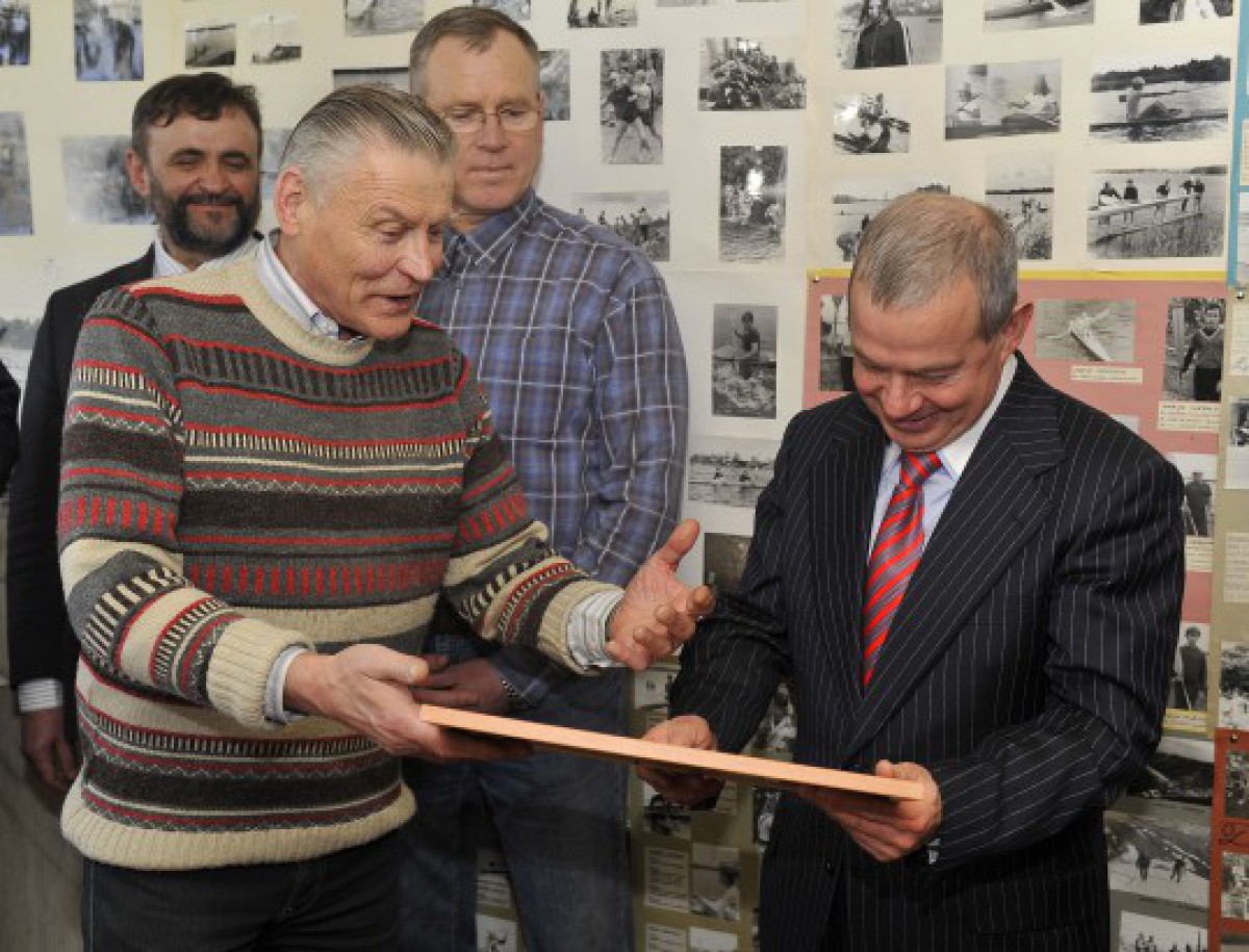 Foto: Ilggadējais airēšanas treneris Ēriks Eglītis pilsētas domes priekšsēdētājam Aivaram Lembergam piemiņai pasniedz attēlu, kurā iemūžināts airēšanas bāzes šī brīža izskats.