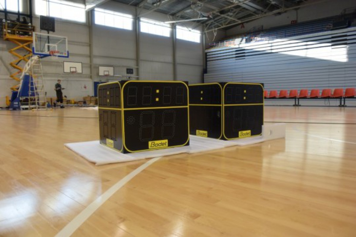 Basketbola hallē uzstāda jaunus sporta spēļu tablo