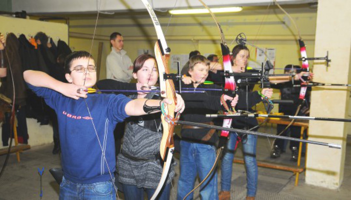 Bērni (7-9 gadi) šauj no 18m pa pilno 80cm mērķi;