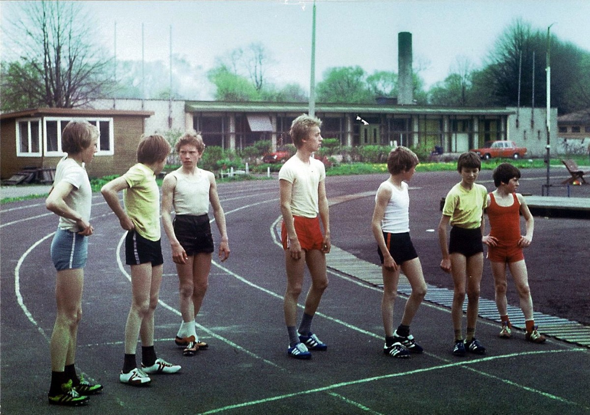 Jaunie vieglatlēti gatavi startam uz sešu celiņu skrejceļa. Fonā vēl nerekonstruētais stadiona paviljons.