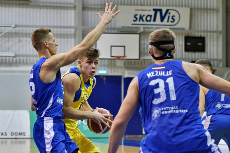 Taču studenti izrādīja pamatīgu pretestību un pirmo puslaiku pabeidza ar tikai viena punkta deficītu (43:44). LU komandā vērtīgu pienesumu sniedza divi spēlētāji, kas spēli sāka kā rezervisti - Reinis Avotiņš un Arvīds Dambenieks kopā divatā pirmajā puslaikā guva 21 punktu, trāpot astoņus no astoņiem metieniem no spēles.