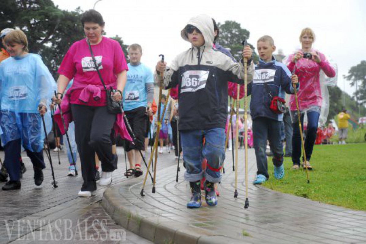 Sestdien Piedzīvojumu parkā pulcējās aktīvās atpūtas cienītāji - Latvijas Nūjošanas 2. festivāla Ventspilī dalībnieki.