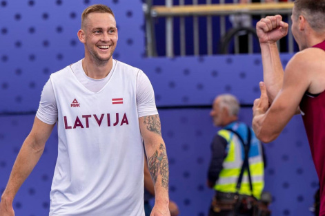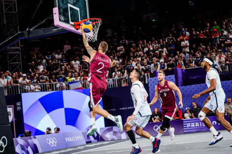 Olimpiskie čempioni Latvijas 3x3 basketbolisti ar Zigmāru Raimo, Franci Lāci, Kārli Lasmani un Nauri Miezi sastāvā ceturtdien grūtā cīņā svinēja ceturto uzvaru četrās Parīzes olimpisko spēļu turnīra spēlēs, atspēlējoties mačā ar ASV. Latvija uzvarēja ar 21:19.
