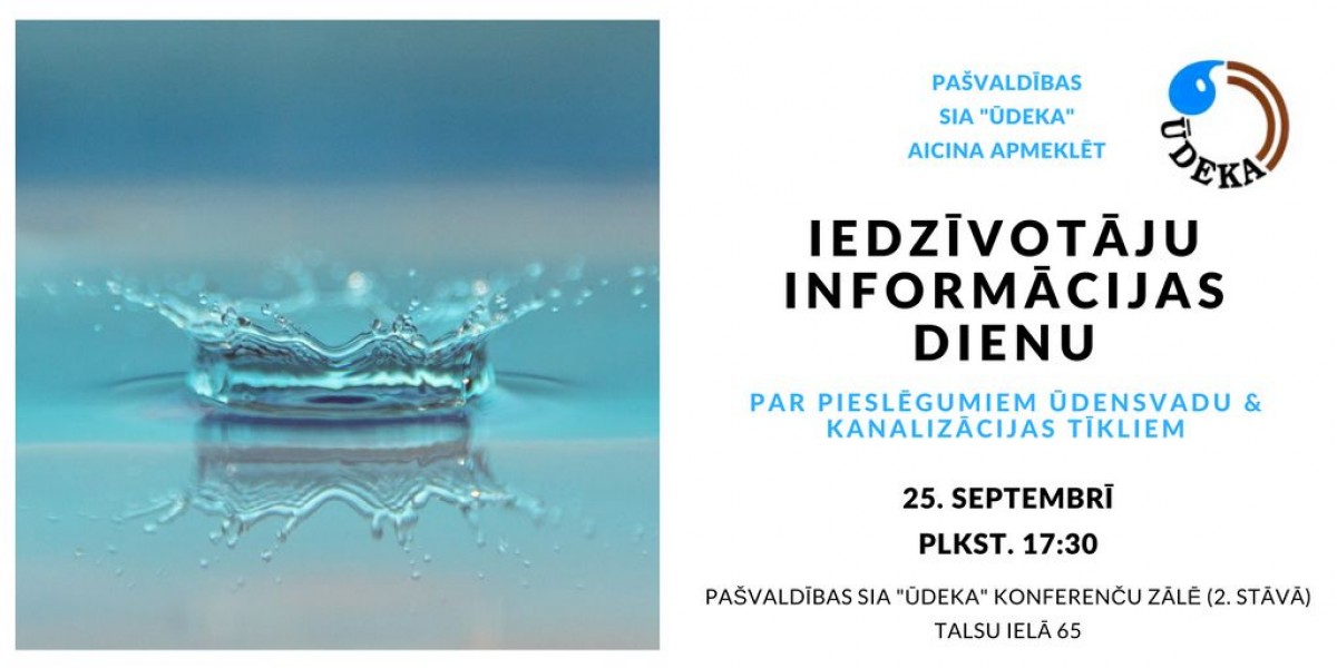 Pirmdien, 25. septembrī, plkst. 17.30 pašvaldības SIA ŪDEKA telpās notiks Iedzīvotāju informācijas diena saistībā ar aktuālajiem jautājumiem par iespēju pieslēgties centralizētajiem ūdensvada un kanalizācijas tīkliem un kļūt par ŪDEKAs klientu.