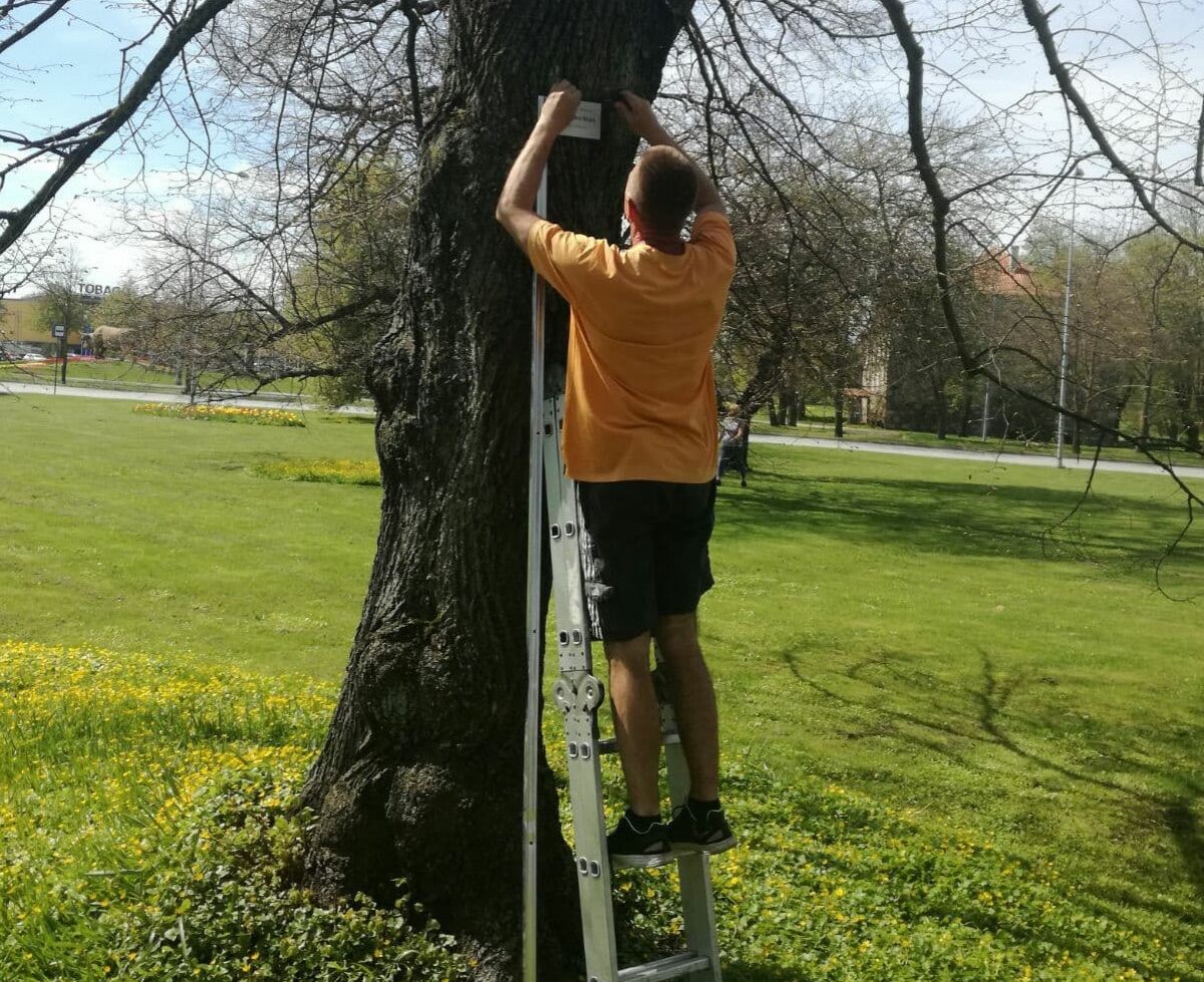 Tilta dārzā uz kokiem uzstādītas informatīvās plāksnītes