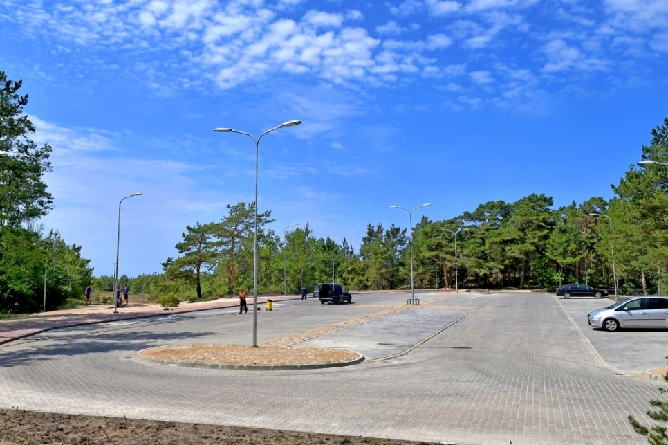 Viens no jaunās publiskās infrastruktūras elementiem – plašs automašīnu stāvlaukums tuvu kāpu zonai.